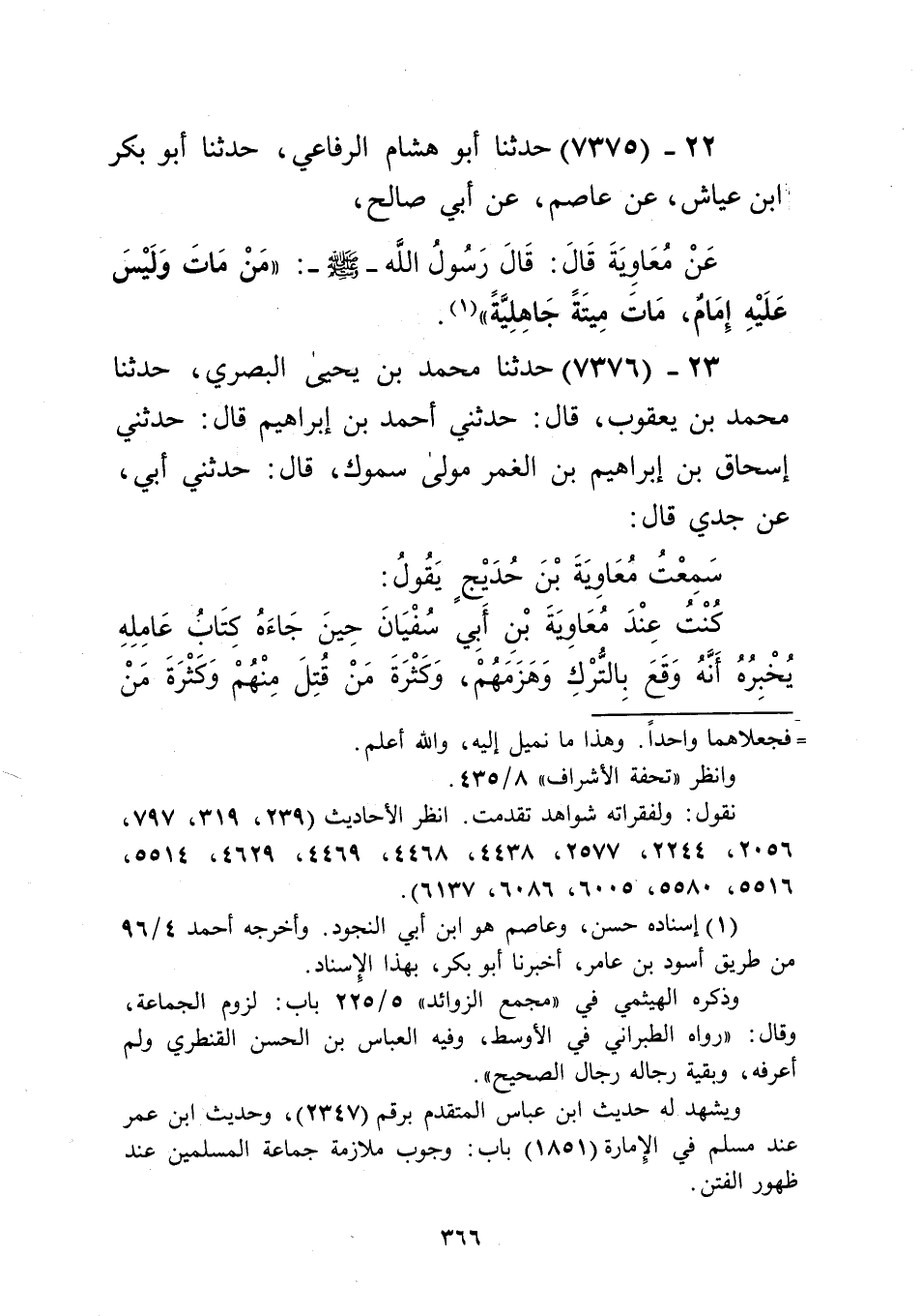 7375 - حَدَّثَنَا أَبُو هِشَامٍ الرِّفَاعِيُّ، حَدَّثَنَا أَبُو بَكْرِ بْنُ عَيَّاشٍ، عَنْ عَاصِمٍ، عَنْ أَبِي صَالِحٍ، عَنْ مُعَاوِيَةَ قَالَ: قَالَ رَسُولُ اللَّهِ صَلَّى اللهُ عَلَيْهِ وَسَلَّمَ: «§مَنْ مَاتَ وَلَيْسَ عَلَيْهِ إِمَامٌ مَاتَ مِيتَةً جَاهِلِيَّةً» Kإسناده حسن