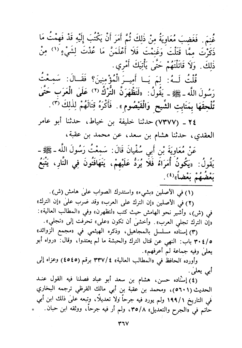7377 - حَدَّثَنَا خَلِيفَةُ بْنُ خَيَّاطٍ، حَدَّثَنَا أَبُو عَامِرٍ الْعَقَدِيُّ، حَدَّثَنَا هِشَامُ بْنُ سَعْدٍ، عَنْ مُحَمَّدِ بْنِ عُقْبَةَ، عَنْ مُعَاوِيَةَ بْنِ أَبِي سُفْيَانَ قَالَ: سَمِعْتُ رَسُولَ اللَّهِ صَلَّى اللهُ عَلَيْهِ وَسَلَّمَ يَقُولُ: «§يَكُونُ أُمَرَاءٌ , فَلَا يُرَدُّ عَلَيْهِمْ , يَتَهَافَتُونَ فِي النَّارِ يَتْبَعُ بَعْضُهُمْ بَعْضًا» Kإسناده حسن