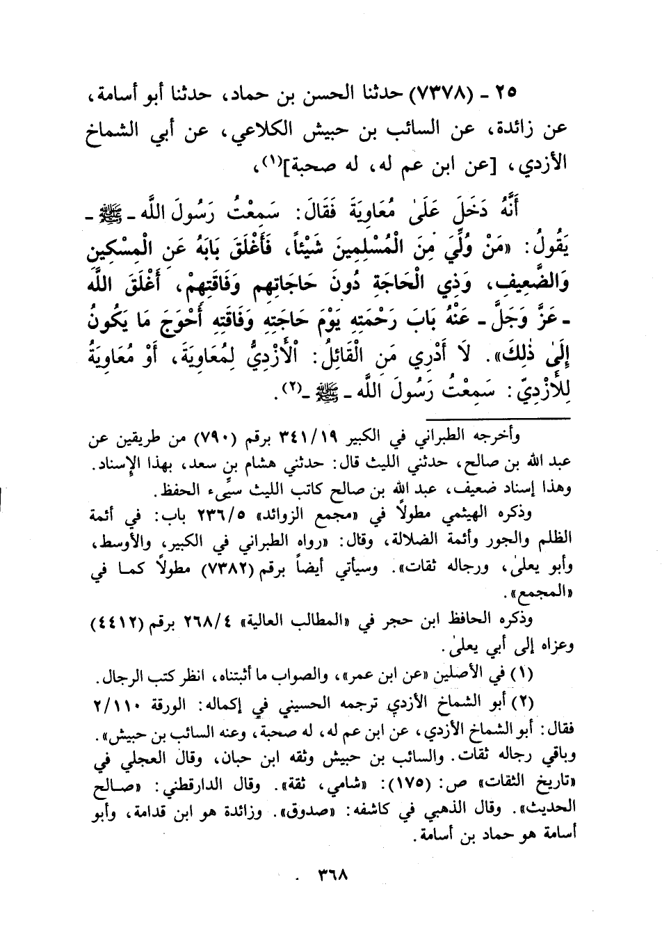 7378 - حَدَّثَنَا الْحَسَنُ بْنُ حَمَّادٍ، حَدَّثَنَا أَبُو أُسَامَةَ، عَنْ زَائِدَةَ، عَنِ السَّائِبِ بْنِ حُبَيْشٍ الْكَلَاعِيِّ، عَنْ أَبِي الشَّمَّاخِ الْأَزْدِيِّ، عَنِ ابْنِ عَمٍّ لَهُ , لَهُ صُحْبَةٌ، أَنَّهُ دَخَلَ عَلَى مُعَاوِيَةَ فَقَالَ: سَمِعْتُ رَسُولَ اللَّهِ صَلَّى اللهُ عَلَيْهِ وَسَلَّمَ يَقُولُ: «§مَنْ وَلِيَ مِنَ الْمُسْلِمِينَ شَيْئًا فَأَغْلَقَ بَابَهُ عَنِ الْمِسْكِينِ وَالضَّعِيفِ، وَذِي الْحَاجَةِ دُونَ حَاجَاتِهِمْ وَفَاقَاتِهِمْ أَغْلَقَ اللَّهُ عَزَّ وَجَلَّ عَنْهُ بَابَ رَحْمَتِهِ يَوْمَ حَاجَتِهِ وَفَاقَتِهِ أَحْوَجَ مَا يَكُونُ إِلَى ذَلِكَ»، لَا أَدْرِي مَنِ الْقَائِلُ الْأَزْدِيُّ لِمُعَاوِيَةَ، أَوْ مُعَاوِيَةُ لِلْأَزْدِيِّ: سَمِعْتُ رَسُولَ اللَّهِ صَلَّى اللهُ عَلَيْهِ وَسَلَّمَ