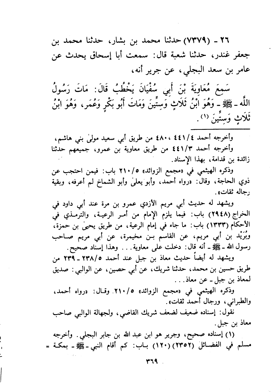 7379 - حَدَّثَنَا مُحَمَّدُ بْنُ بَشَّارٍ، حَدَّثَنَا مُحَمَّدُ بْنُ جَعْفَرٍ غُنْدَرٌ، حَدَّثَنَا شُعْبَةُ، قَالَ: سَمِعْتُ أَبَا إِسْحَاقَ يُحَدِّثُ، عَنْ عَامِرِ بْنِ سَعْدٍ الْبَجَلِيِّ، عَنْ جَرِيرٍ، أَنَّهُ سَمِعَ مُعَاوِيَةَ بْنَ أَبِي سُفْيَانَ يَخْطُبُ , قَالَ: «§مَاتَ رَسُولُ اللَّهِ صَلَّى اللهُ عَلَيْهِ وَسَلَّمَ وَهُوَ ابْنُ ثَلَاثٍ وَسِتِّينَ، وَمَاتَ أَبُو بَكْرٍ وَعُمَرُ وَهُوَ ابْنُ ثَلَاثٍ وَسِتِّينَ» Kإسناده صحيح