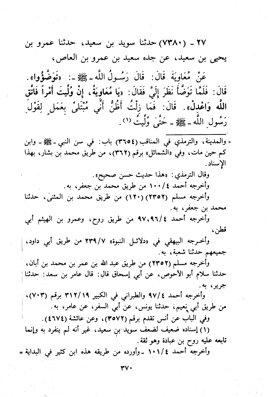 7380 - حَدَّثَنَا سُوَيْدُ بْنُ سَعِيدٍ، حَدَّثَنَا عَمْرُو بْنُ يَحْيَى بْنِ سَعِيدٍ، عَنْ جَدِّهِ سَعِيدِ بْنِ عَمْرِو بْنِ الْعَاصِ، عَنْ مُعَاوِيَةَ قَالَ: قَالَ رَسُولُ اللَّهِ صَلَّى اللهُ عَلَيْهِ وَسَلَّمَ: «تَوَضَّئُوا»، قَالَ: فَلَمَّا تَوَضَّأَ نَظَرَ إِلَيَّ , فَقَالَ: «§يَا مُعَاوِيَةُ، إِنْ وُلِّيتَ أَمْرًا فَاتَّقِ اللَّهَ , وَاعْدِلْ»، قَالَ: فَمَا زِلْتُ أَظُنُّ أَنِّي مُبْتَلًى بِعَمَلٍ لِقَوْلِ رَسُولِ اللَّهِ صَلَّى اللهُ عَلَيْهِ وَسَلَّمَ حَتَّى وُلِّيتُKإسناده ضعيف