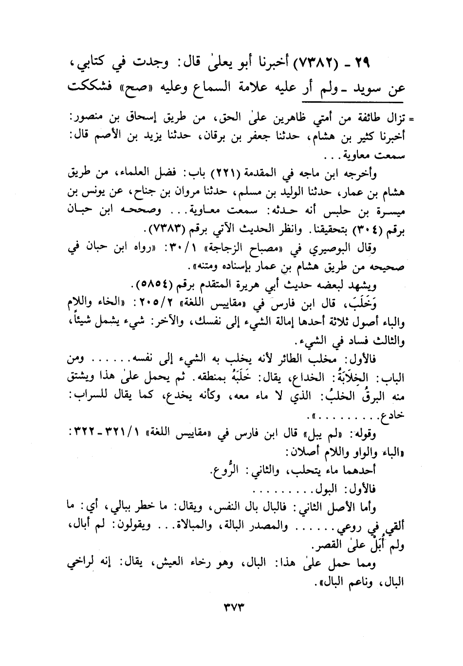 7382 - أَخْبَرَنَا أَبُو يَعْلَى قَالَ: وَجَدْتُ فِي كِتَابِي، عَنْ سُوَيْدٍ ـ وَلَمْ أَرَ عَلَيْهِ عَلَامَةَ السَّمَاعِ , وَعَلَيْهِ (صَحَّ) فَشَكَكْتُ -[374]- فِيهِ، وَأَكْبَرُ ظَنِّي أَنِّي سَمِعْتُهُ مِنْهُ ـ عَنْ ضِمَامِ بْنِ إِسْمَاعِيلَ الْمَعَافِرِيِّ، عَنْ أَبِي قَبِيلٍ قَالَ: خَطَبَنَا مُعَاوِيَةُ فِي يَوْمِ جُمُعَةٍ فَقَالَ: إِنَّمَا الْمَالُ مَالُنَا وَالْفَيْءُ فَيْئُنَا، مَنْ شِئْنَا أَعْطَيْنَا , وَمَنْ شِئْنَا مَنَعْنَا، فَلَمْ يَرُدَّ عَلَيْهِ أَحَدٌ، فَلَمَّا كَانَتِ الْجُمُعَةُ الثَّانِيَةُ، قَالَ مِثْلَ مَقَالَتِهِ، فَلَمْ يَرُدَّ عَلَيْهِ أَحَدٌ، فَلَمَّا كَانَتِ الْجُمُعَةُ الثَّالِثَةُ، قَالَ مِثْلَ مَقَالَتِهِ، فَقَامَ إِلَيْهِ رَجُلٌ مِمَّنْ شَهِدَ الْمَسْجِدَ فَقَالَ: كَلَّا , بَلِ الْمَالُ مَالُنَا وَالْفَيْءُ فَيْئُنَا، مَنْ حَالَ بَيْنَنَا وَبَيْنَهُ حَاكَمْنَاهُ بِأَسْيَافِنَا، فَلَمَّا صَلَّى أَمَرَ بِالرَّجُلِ , فَأُدْخِلَ عَلَيْهِ، فَأَجْلَسَهُ مَعَهُ عَلَى السَّرِيرِ، ثُمَّ أَذِنَ لِلنَّاسِ فَدَخَلُوا عَلَيْهِ، ثُمَّ قَالَ: أَيُّهَا النَّاسُ , إِنِّي تَكَلَّمْتُ فِي أَوَّلِ جُمُعَةٍ فَلَمْ يَرُدَّ عَلَيَّ أَحَدٌ، وَفِي الثَّانِيَةِ فَلَمْ يَرُدَّ عَلَيَّ أَحَدٌ، فَلَمَّا كَانَتِ الثَّالِثَةُ أَحْيَانِي هَذَا أَحْيَاهُ اللَّهُ، سَمِعْتُ رَسُولَ اللَّهِ صَلَّى اللهُ عَلَيْهِ وَسَلَّمَ يَقُولُ: «§سَيَأْتِي قَوْمٌ يَتَكَلَّمُونَ , فَلَا يُرَدُّ عَلَيْهِمْ، يَتَقَاحَمُونَ فِي النَّارِ تَقَاحُمَ الْقِرَدَةِ»، فَخَشِيتُ أَنْ يَجْعَلَنِيَ اللَّهُ مِنْهُمْ، فَلَمَّا رَدَّ هَذَا عَلَيَّ أَحْيَانِي , أَحْيَاهُ اللَّهُ، وَرَجَوْتُ أَنْ لَا يَجْعَلَنِيَ اللَّهُ مِنْهُمْKإسناده صحيح