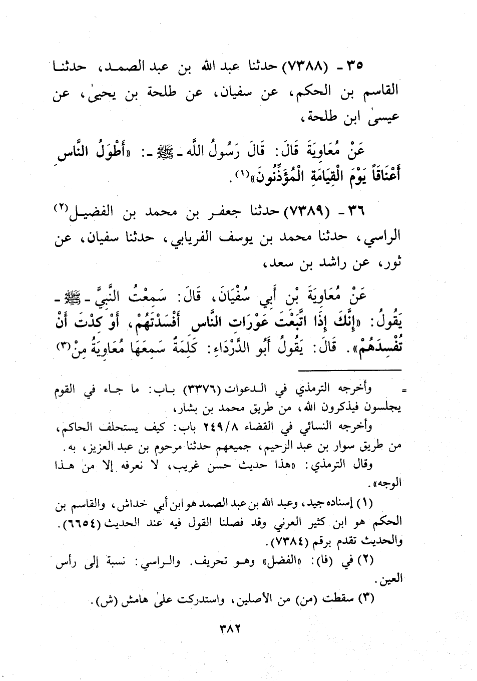 7388 - حَدَّثَنَا عَبْدُ اللَّهِ بْنُ عَبْدِ الصَّمَدِ، حَدَّثَنَا الْقَاسِمُ بْنُ الْحَكَمِ، عَنْ سُفْيَانَ، عَنْ طَلْحَةَ بْنِ يَحْيَى، عَنْ عِيسَى بْنِ طَلْحَةَ، عَنْ مُعَاوِيَةَ قَالَ: قَالَ رَسُولُ اللَّهِ صَلَّى اللهُ عَلَيْهِ وَسَلَّمَ: «§أَطْوَلُ النَّاسِ أَعْنَاقًا يَوْمَ الْقِيَامَةِ الْمُؤَذِّنُونَ» Kإسناده جيد