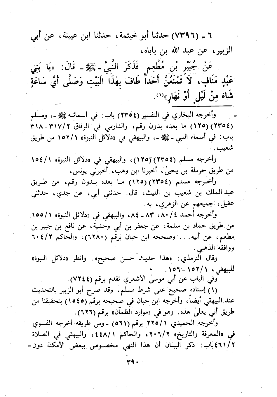 7396 - حَدَّثَنَا أَبُو خَيْثَمَةَ، حَدَّثَنَا ابْنُ عُيَيْنَةَ، عَنْ أَبِي الزُّبَيْرِ، عَنْ عَبْدِ اللَّهِ بْنِ بَابَاهْ، عَنْ جُبَيْرِ بْنِ مُطْعِمٍ، فَذَكَرَ النَّبِيَّ صَلَّى اللهُ عَلَيْهِ وَسَلَّمَ قَالَ: «يَا بَنِي عَبْدِ مَنَافٍ §لَا تَمْنَعُنَّ أَحَدًا طَافَ بِهَذَا الْبَيْتِ وَصَلَّى أَيَّ سَاعَةٍ شَاءَ مِنْ لَيْلٍ أَوْ نَهَارٍ» Kإسناده صحيح على شرط مسلم