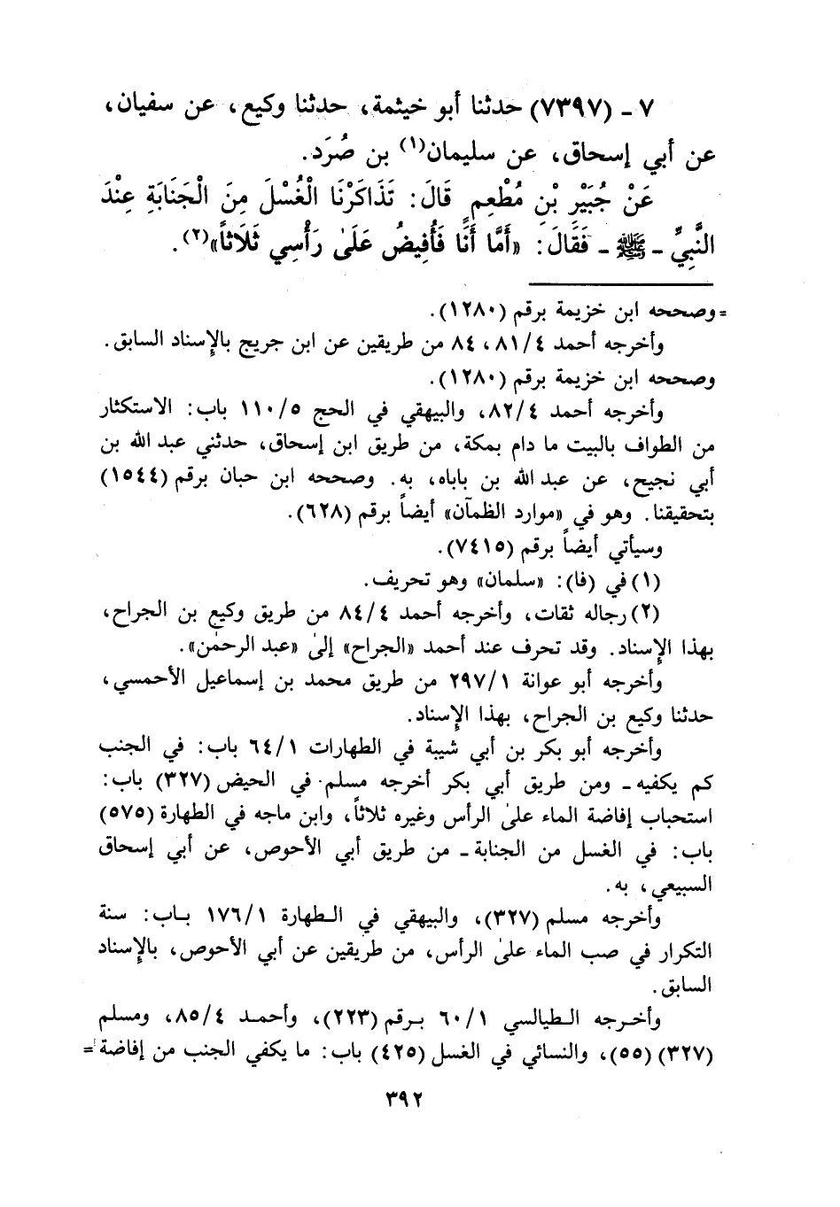 7397 - حَدَّثَنَا أَبُو خَيْثَمَةَ، حَدَّثَنَا وَكِيعٌ، عَنْ سُفْيَانَ، عَنْ أَبِي إِسْحَاقَ، عَنْ سُلَيْمَانَ بْنِ صُرَدَ، عَنْ جُبَيْرِ بْنِ مُطْعِمٍ، قَالَ: تَذَاكَرْنَا الْغُسْلَ مِنَ الْجَنَابَةِ عِنْدَ النَّبِيِّ صَلَّى اللهُ عَلَيْهِ وَسَلَّمَ، فَقَالَ: «§أَمَّا أَنَا فَأُفِيضُ عَلَى رَأْسِي ثَلَاثًا» Kرجاله ثقات