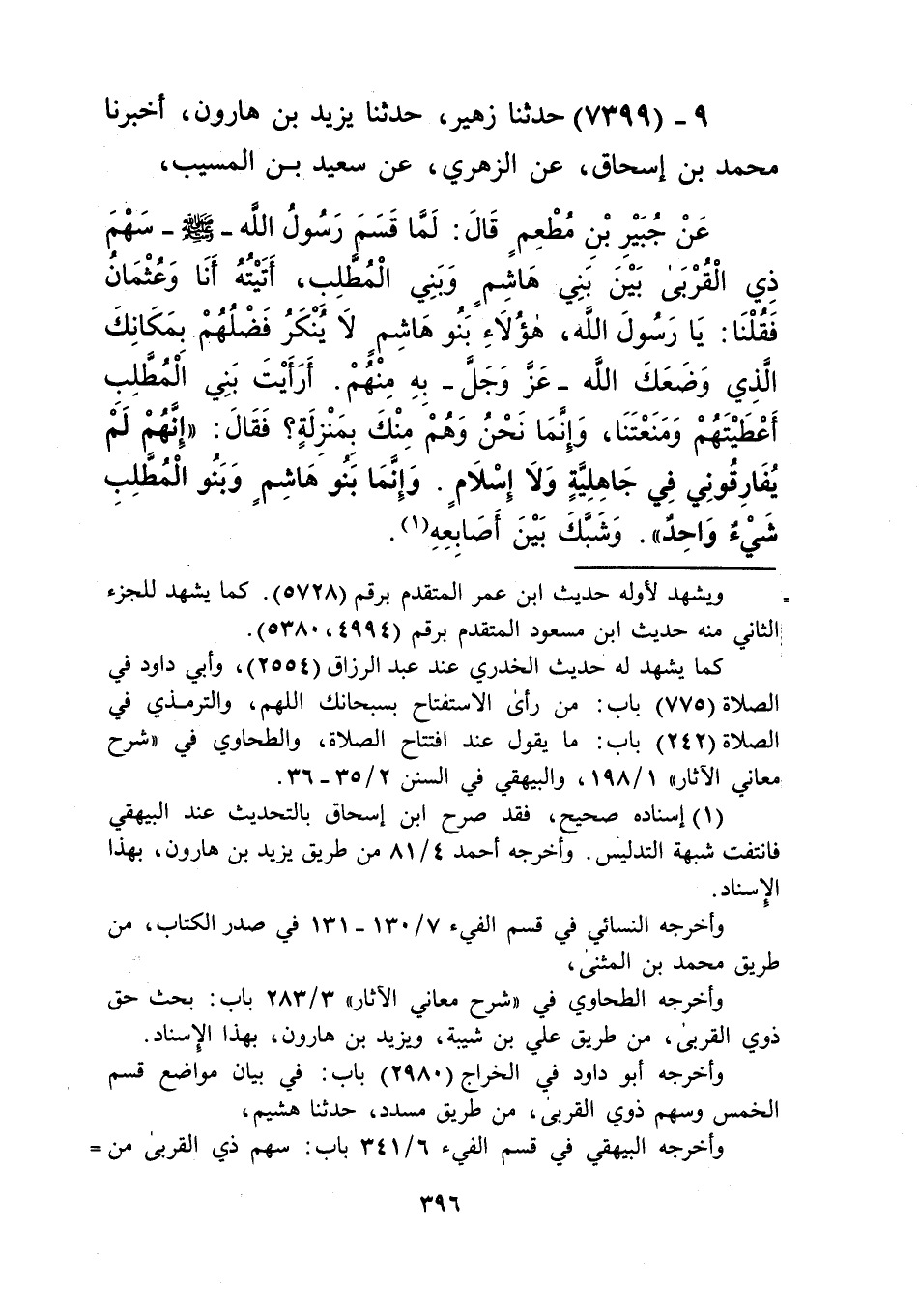 7399 - حَدَّثَنَا زُهَيْرٌ، حَدَّثَنَا يَزِيدُ بْنُ هَارُونَ، أَخْبَرَنَا مُحَمَّدُ بْنُ إِسْحَاقَ، عَنِ الزُّهْرِيِّ، عَنْ سَعِيدِ بْنِ الْمُسَيِّبِ، عَنْ جُبَيْرِ بْنِ مُطْعِمٍ، قَالَ: لَمَّا قَسَمَ رَسُولُ اللَّهِ صَلَّى اللهُ عَلَيْهِ وَسَلَّمَ سَهْمَ ذِي الْقُرْبَى بَيْنَ بَنِي هَاشِمٍ، وَبَنِي الْمُطَّلِبِ أَتَيْتُهُ أَنَا وَعُثْمَانُ، فَقُلْنَا: يَا رَسُولَ اللَّهِ , هَؤُلَاءِ بَنُو هَاشِمٍ لَا يُنْكَرُ فَضْلُهُمْ بِمَكَانِكَ الَّذِي وَضَعَكَ اللَّهُ عَزَّ وَجَلَّ بِهِ مِنْهُمْ، أَرَأَيْتَ بَنِي الْمُطَّلِبِ أَعْطَيْتَهُمْ وَمَنَعْتَنَا، وَإِنَّمَا نَحْنُ وَهُمْ مِنْكَ بِمَنْزِلَةٍ، فَقَالَ: «إِنَّهُمْ لَمْ يُفَارِقُونِي فِي جَاهِلِيَّةٍ وَلَا إِسْلَامٍ، §وَإِنَّمَا بَنُو هَاشِمٍ وَبَنُو الْمُطَّلِبِ شَيْءٌ وَاحِدٌ» وَشَبَّكَ بَيْنَ أَصَابِعِهِKإسناده صحيح