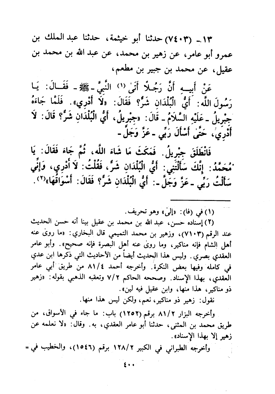 7403 - حَدَّثَنَا أَبُو خَيْثَمَةَ، حَدَّثَنَا عَبْدُ الْمَلِكِ بْنُ عَمْرٍو أَبُو عَامِرٍ، عَنْ زُهَيْرِ بْنِ مُحَمَّدٍ، عَنْ عَبْدِ اللَّهِ بْنِ مُحَمَّدِ بْنِ عُقَيْلٍ، عَنْ مُحَمَّدِ بْنِ جُبَيْرِ بْنِ مُطْعِمٍ، عَنْ أَبِيهِ، أَنَّ رَجُلًا أَتَى النَّبِيَّ صَلَّى اللهُ عَلَيْهِ وَسَلَّمَ، فَقَالَ: يَا رَسُولَ اللَّهِ، §أَيُّ الْبُلْدَانِ شَرٌّ؟ فَقَالَ: «لَا أَدْرِي» فَلَمَّا جَاءَهُ جِبْرِيلُ عَلَيْهِ السَّلَامُ قَالَ: «جِبْرِيلُ أَيُّ الْبُلْدَانِ شَرٌّ»، قَالَ: لَا أَدْرِي حَتَّى أَسْأَلَ رَبِّيَ عَزَّ وَجَلَّ، فَانْطَلَقَ جِبْرِيلُ، فَمَكَثَ مَا شَاءَ اللَّهُ، ثُمَّ جَاءَ، فَقَالَ: يَا مُحَمَّدُ إِنَّكَ سَأَلَتْنِي: أَيُّ الْبُلْدَانِ شَرٌّ؟ فَقُلْتُ: لَا أَدْرِي، وَإِنِّي سَأَلْتُ رَبِّيَ عَزَّ وَجَلَّ: أَيُّ الْبُلْدَانِ شَرٌّ؟ فَقَالَ: أَسْوَاقُهَا "Kإسناده حسن