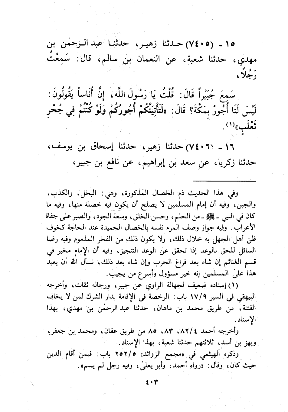 7405 - حَدَّثَنَا زُهَيْرٌ، حَدَّثَنَا عَبْدُ الرَّحْمَنِ بْنُ مَهْدِيٍّ، حَدَّثَنَا شُعْبَةُ، عَنِ النُّعْمَانِ بْنِ سَالِمٍ، قَالَ: سَمِعْتُ رَجُلًا، سَمِعَ جُبَيْرًا، قَالَ: قُلْتُ: يَا رَسُولَ اللَّهِ , إِنَّ أُنَاسًا يَقُولُونَ لَيْسَ لَنَا أُجُورٌ بِمَكَّةَ، قَالَ: «§لَتَأْتِيَنَّكُمْ أُجُورُكُمْ وَلَوْ كُنْتُمْ فِي جُحْرِ ثَعْلَبٍ» Kإسناده ضعيف
