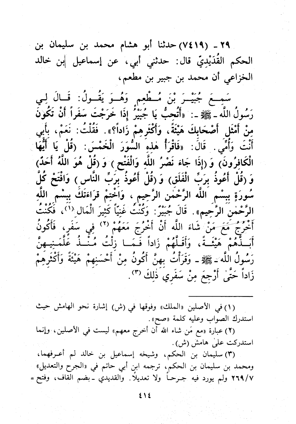 7419 - حَدَّثَنَا أَبُو هِشَامٍ مُحَمَّدُ بْنُ سُلَيْمَانَ بْنِ الْحَكَمِ الْقُدَيْدِيُّ، قَالَ: حَدَّثَنِي أَبِي، عَنْ إِسْمَاعِيلَ بْنِ خَالِدٍ الْخُزَاعِيِّ، أَنَّ مُحَمَّدَ بْنَ جُبَيْرِ بْنِ مُطْعِمٍ، سَمِعَ جُبَيْرَ بْنَ مُطْعِمٍ، وَهُوَ يَقُولُ: قَالَ لِي رَسُولُ اللَّهِ صَلَّى اللهُ عَلَيْهِ وَسَلَّمَ: «أَتُحِبُّ يَا جُبَيْرُ إِذَا خَرَجْتَ سَفَرًا أَنْ تَكُونَ مِنْ أَمْثَلِ أَصْحَابِكَ هَيْئَةً , وَأَكْثَرِهِمْ زَادًا؟» فَقُلْتُ: نَعَمْ، بِأَبِي أَنْتَ وَأُمِّي، قَالَ: «§فَاقْرَأْ هَذِهِ السُّوَرَ الْخَمْسَ، قُلْ يَأَيُّهَا الْكَافِرُونَ، وَإِذَا جَاءَ نَصْرُ اللَّهِ وَالْفَتْحُ، وَقُلْ هُوَ اللَّهُ أَحَدٌ، وَقُلْ أَعُوذُ بِرَبِّ الْفَلَقِ، وَقُلْ أَعُوذُ بِرَبِّ النَّاسِ، وَافْتَحْ كُلَّ سُورَةٍ بِبِسْمِ اللَّهِ الرَّحْمَنِ الرَّحِيمِ، وَاخْتِمْ قِرَاءَتَكَ بِبِسْمِ اللَّهِ الرَّحْمَنِ الرَّحِيمِ» قَالَ جُبَيْرٌ: وَكُنْتُ غَنِيًّا كَثِيرَ الْمَالِ، فَكُنْتُ أَخْرُجُ مَعَ مَنْ شَاءَ اللَّهُ أَنْ أَخْرُجَ مَعَهُمْ فِي سَفَرٍ، فَأَكُونَ أَبَذَّهُمْ هَيْئَةً , وَأَقَلَّهُمْ زَادًا، فَمَا زِلْتُ مُنْذُ عَلَّمَنِيهِنَّ رَسُولُ اللَّهِ صَلَّى اللهُ عَلَيْهِ وَسَلَّمَ، وَقَرَأْتُ بِهِنَّ , أَكُونُ مِنْ أَحْسَنِهِمْ هَيْئَةً , وَأَكْثَرِهِمْ زَادًا حَتَّى أَرْجِعَ مِنْ سَفَرِي ذَلِكَ