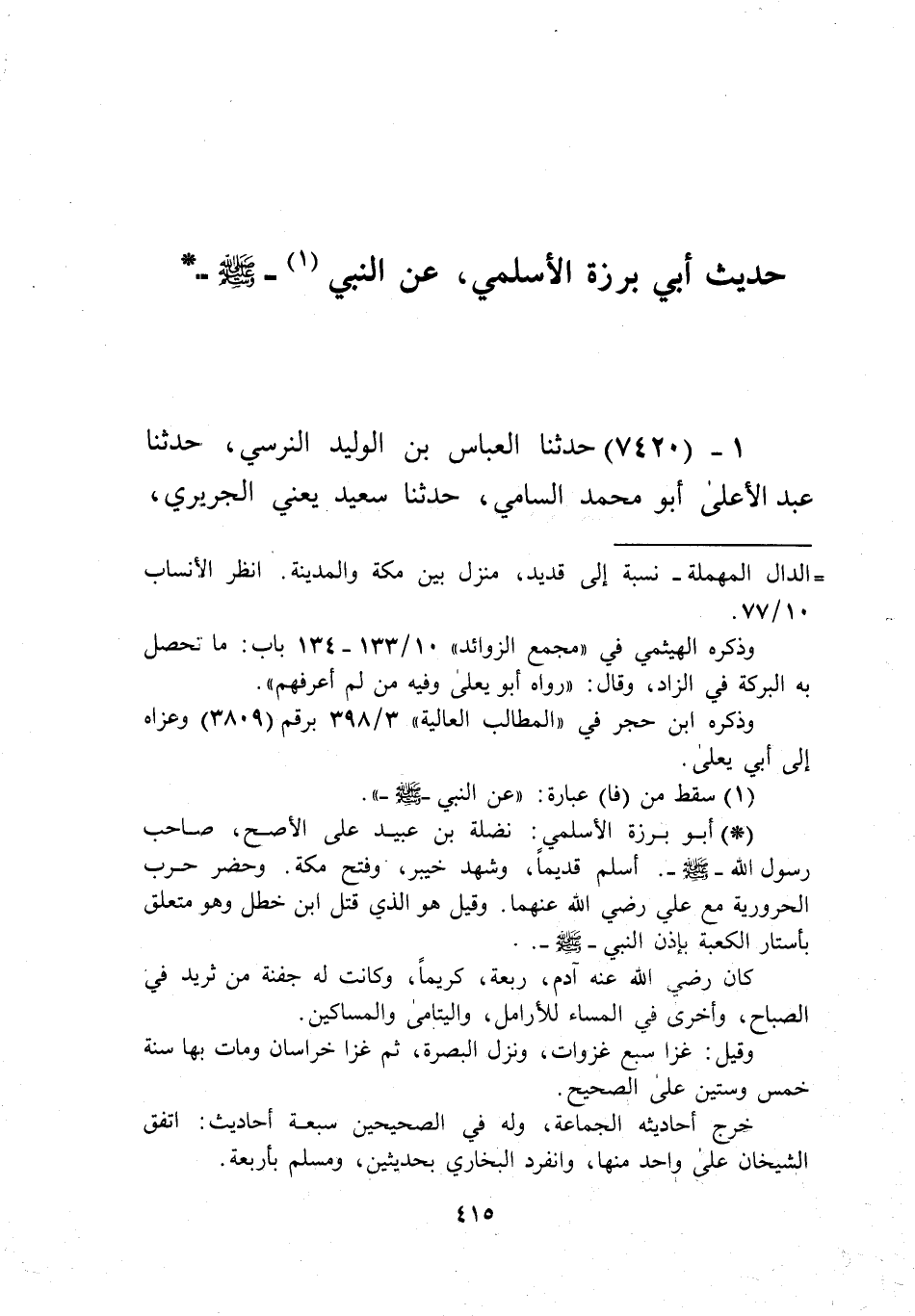 7420 - حَدَّثَنَا الْعَبَّاسُ بْنُ الْوَلِيدِ النَّرْسِيُّ، حَدَّثَنَا عَبْدُ الْأَعْلَى أَبُو مُحَمَّدٍ السَّامِيُّ، حَدَّثَنَا سَعِيدٌ يَعْنِي الْجُرَيْرِيَّ -[416]-، عَنْ أَبِي نَضْرَةَ، عَنْ عَبْدِ اللَّهِ بْنِ مَوَلَةَ الْقُشَيْرِيِّ، قَالَ: كُنْتُ بِالْأَهْوَازِ إِذْ مَرَّ بِي شَيْخٌ ضَخْمٌ عَلَى بَغْلَةٍ وَهُوَ يَقُولُ: اللَّهُمَّ ذَهَبَ قَرْنِي مِنْ هَذِهِ الْأُمَّةِ , فَأَلْحِقْنِي بِهِمْ، فَأَلْحَقْتُهُ دَابَّتِي، فَقُلْتُ: «وَأَنَا يَرْحَمُكَ اللَّهُ»، قَالَ: وَصَاحِبِي هَذَا إِنْ أَرَادَ ذَلِكَ، قَالَ: ثُمَّ قَالَ: قَالَ رَسُولُ اللَّهِ صَلَّى اللهُ عَلَيْهِ وَسَلَّمَ: «§خَيْرُ أُمَّتِي قَرْنِي، ثُمَّ الَّذِينَ يَلُونَهُمْ» فَلَا أَدْرِي أَذَكَرَ الثَّالِثَ، أَمْ لَا - «ثُمَّ يَخْلُفُ قَوْمٌ يَظْهَرُ فِيهُمُ السِّمَنُ وَيُهْرِيقُونَ الشَّهَادَةَ، وَلَا يَسْأَلُونَهَا، فَإِذَا هُوَ أَبُو بَرْزَةَ الْأَسْلَمِيُّ» Kإسناده صحيح