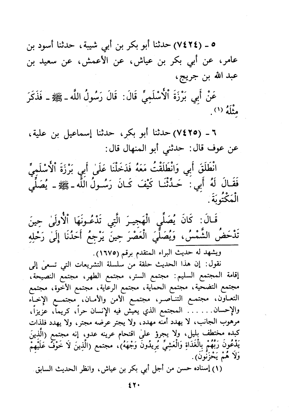 7425 - حَدَّثَنَا أَبُو بَكْرٍ، حَدَّثَنَا إِسْمَاعِيلُ ابْنُ عُلَيَّةَ، عَنْ عَوْفٍ، قَالَ: حَدَّثَنِي أَبُو الْمِنْهَالِ، قَالَ: انْطَلَقَ أَبِي , وَانْطَلَقْتُ مَعَهُ , فَدَخَلْنَا عَلَى أَبِي بَرْزَةَ الْأَسْلَمِيِّ، فَقَالَ لَهُ أَبِي: حَدِّثْنَا كَيْفَ كَانَ رَسُولُ اللَّهِ صَلَّى اللهُ عَلَيْهِ وَسَلَّمَ يُصَلِّي الْمَكْتُوبَةَ، قَالَ: " كَانَ §يُصَلِّي الْهَجِيرَ الَّتِي تَدْعُونَهَا الْأُولَى حِينَ تَدْحَضُ الشَّمْسُ، وَيُصَلِّي الْعَصْرَ حِينَ يَرْجِعُ أَحَدُنَا إِلَى رَحْلِهِ فِي أَقْصَى الْمَدِينَةِ وَالشَّمْسُ حَيَّةٌ، قَالَ: وَنَسِيتُ مَا قَالَ فِي الْمَغْرِبِ، قَالَ: وَكَانَ يَسْتَحِبُّ أَنَّ يُؤَخِّرَ الْعِشَاءَ الَّتِي تَدْعُونَهَا الْعَتَمَةَ، وَكَانَ يَكْرَهُ النَّوْمَ قَبْلَهَا، وَالْحَدِيثَ بَعْدَهَا، وَكَانَ يَنْفَتِلُ مِنْ صَلَاةِ الْغَدَاةِ حِينَ يَعْرِفُ الرَّجُلُ جَلِيسَهُ، وَكَانَ يَقْرَأُ بِالسِّتِّينَ إِلَى الْمِائَةِ "Kإسناده صحيح