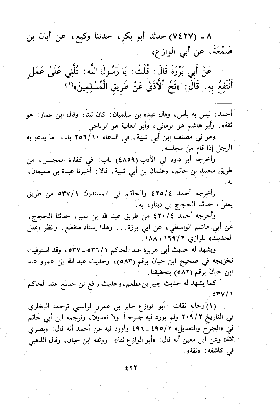 7427 - حَدَّثَنَا أَبُو بَكْرٍ، حَدَّثَنَا وَكِيعٌ، عَنْ أَبَانَ بْنِ صَمْعَةَ، عَنْ أَبِي الْوَازِعِ، عَنْ أَبِي بَرْزَةَ، قَالَ: قُلْتُ: يَا رَسُولَ اللَّهِ , دُلَّنِي عَلَى عَمَلٍ أَنْتَفِعُ بِهِ، قَالَ: «§نَحِّ الْأَذَى عَنْ طَرِيقِ الْمُسْلِمِينَ» Kرجاله ثقات