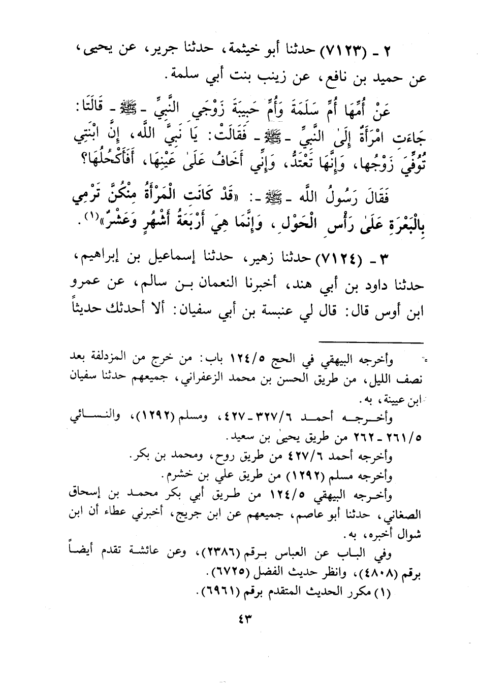 7123 - حَدَّثَنَا أَبُو خَيْثَمَةَ، حَدَّثَنَا جَرِيرٌ، عَنْ يَحْيَى، عَنْ حُمَيْدِ بْنِ نَافِعٍ، عَنْ زَيْنَبَ بِنْتِ أَبِي سَلَمَةَ، عَنْ أُمِّهَا أُمِّ سَلَمَةَ، وَأَمِّ حَبِيبَةَ زَوْجَيِ النَّبِيِّ صَلَّى اللهُ عَلَيْهِ وَسَلَّمَ , قَالَتَا: جَاءَتِ امْرَأَةٌ إِلَى النَّبِيِّ صَلَّى اللهُ عَلَيْهِ وَسَلَّمَ، فَقَالَتْ: يَا نَبِيَّ اللَّهِ، إِنَّ ابْنَتِي تُوُفِّيَ زَوْجُهَا، وَإِنَّهَا تَعْتَدُّ، وَإِنِّي أَخَافُ عَلَى عَيْنِهَا، أَفَأَكْحَلُهَا؟ فَقَالَ رَسُولُ اللَّهِ صَلَّى اللهُ عَلَيْهِ وَسَلَّمَ: «§قَدْ كَانَتِ الْمَرْأَةُ مِنْكُنَّ تَرْمِي بِالْبَعْرَةِ عَلَى رَأْسِ الْحَوْلِ، وَإِنَّمَا هِيَ أَرْبَعَةُ أَشْهُرٍ وَعَشْرٌ»