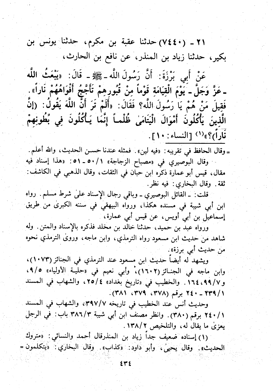 7440 - حَدَّثَنَا عُقْبَةُ بْنُ مُكْرَمٍ، حَدَّثَنَا يُونُسُ بْنُ بُكَيْرٍ، حَدَّثَنَا زِيَادُ بْنُ الْمُنْذِرِ، عَنْ نَافِعِ بْنِ الْحَارِثِ، عَنْ أَبِي بَرْزَةَ، أَنَّ رَسُولَ اللَّهِ صَلَّى اللهُ عَلَيْهِ وَسَلَّمَ قَالَ: «§يَبْعَثُ اللَّهُ عَزَّ وَجَلَّ يَوْمَ الْقِيَامَةِ قَوْمًا مِنْ قُبُورِهِمْ تَأَجَّجُ أَفْوَاهُهُمْ نَارًا» فَقِيلَ: مَنْ هُمْ يَا رَسُولَ اللَّهِ، فَقَالَ: " أَلَمْ تَرَ أَنَّ اللَّهَ يَقُولُ: {إِنَّ الَّذِينَ يَأْكُلُونَ أَمْوَالَ الْيَتَامَى ظُلْمًا إِنَّمَا يَأْكُلُونَ فِي بُطُونِهِمْ نَارًا} [النساء: 10] "؟ Kإسناده ضعيف جدا