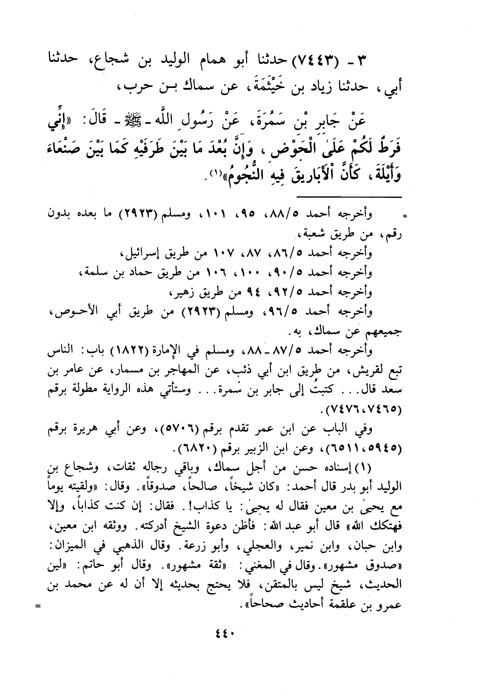 7443 - حَدَّثَنَا أَبُو هَمَّامٍ الْوَلِيدُ بْنُ شُجَاعٍ، حَدَّثَنَا أَبِي، حَدَّثَنَا زِيَادُ بْنُ خَيْثَمَةَ، عَنْ سِمَاكِ بْنِ حَرْبٍ، عَنْ جَابِرِ بْنِ سَمُرَةَ، عَنْ رَسُولِ اللَّهِ صَلَّى اللهُ عَلَيْهِ وَسَلَّمَ قَالَ: «§إِنِّي فَرَطٌ لَكُمْ عَلَى الْحَوْضِ، وَإِنَّ بُعْدَ مَا بَيْنَ طَرَفَيْهِ كَمَا بَيْنَ صَنْعَاءَ وَأَيْلَةَ كَأَنَّ الْأَبَارِيقَ فِيهِ النُّجُومُ» Kإسناده حسن
