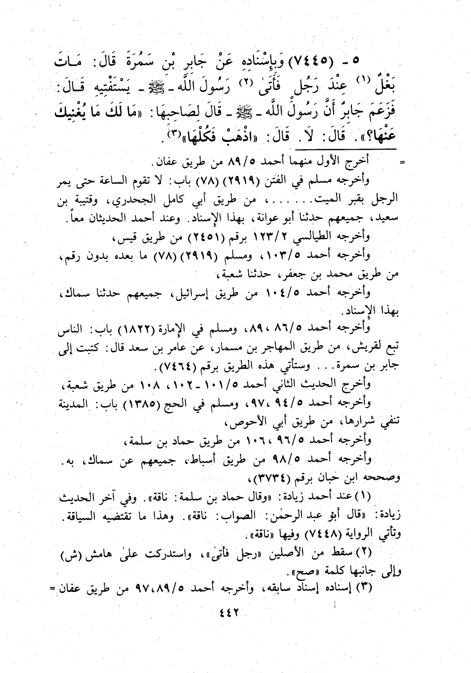 7445 - وَبِإِسْنَادِهِ، عَنْ جَابِرِ بْنِ سَمُرَةَ، قَالَ: مَاتَ بَغْلٌ عِنْدَ رَجُلٍ , فَأَتَى رَسُولَ اللَّهِ صَلَّى اللهُ عَلَيْهِ وَسَلَّمَ يَسْتَفْتِيهِ، قَالَ: فَزَعَمَ جَابِرٌ أَنَّ رَسُولَ اللَّهِ صَلَّى اللهُ عَلَيْهِ وَسَلَّمَ، قَالَ لِصَاحِبِهَا: «§مَا لَكَ مَا يُغْنِيكَ عَنْهَا؟» قَالَ: لَا، قَالَ: «اذْهَبْ فَكُلْهَا» Kإسناده حسن