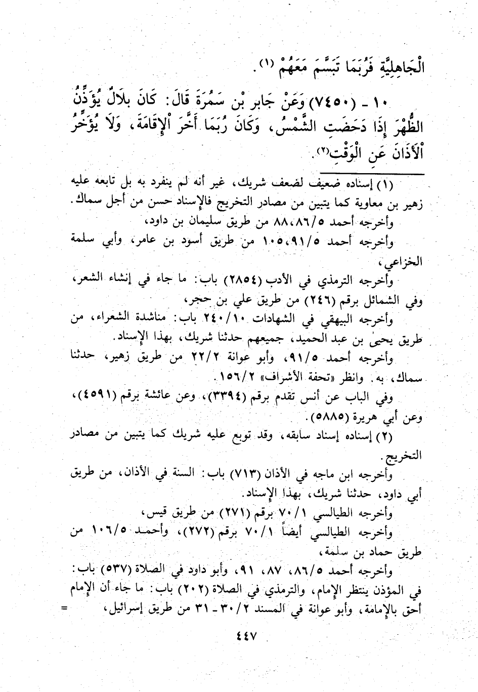 7450 - وَعَنْ جَابِرِ بْنِ سَمُرَةَ، قَالَ: «كَانَ §بِلَالٌ يُؤَذِّنُ الظُّهْرَ إِذَا دَحَضَتِ الشَّمْسُ، وَكَانَ رُبَّمَا أَخَّرَ الْإِقَامَةَ , وَلَا يُؤَخِّرُ الْأَذَانَ عَنِ الْوَقْتِ» Kإسناده ضعيف