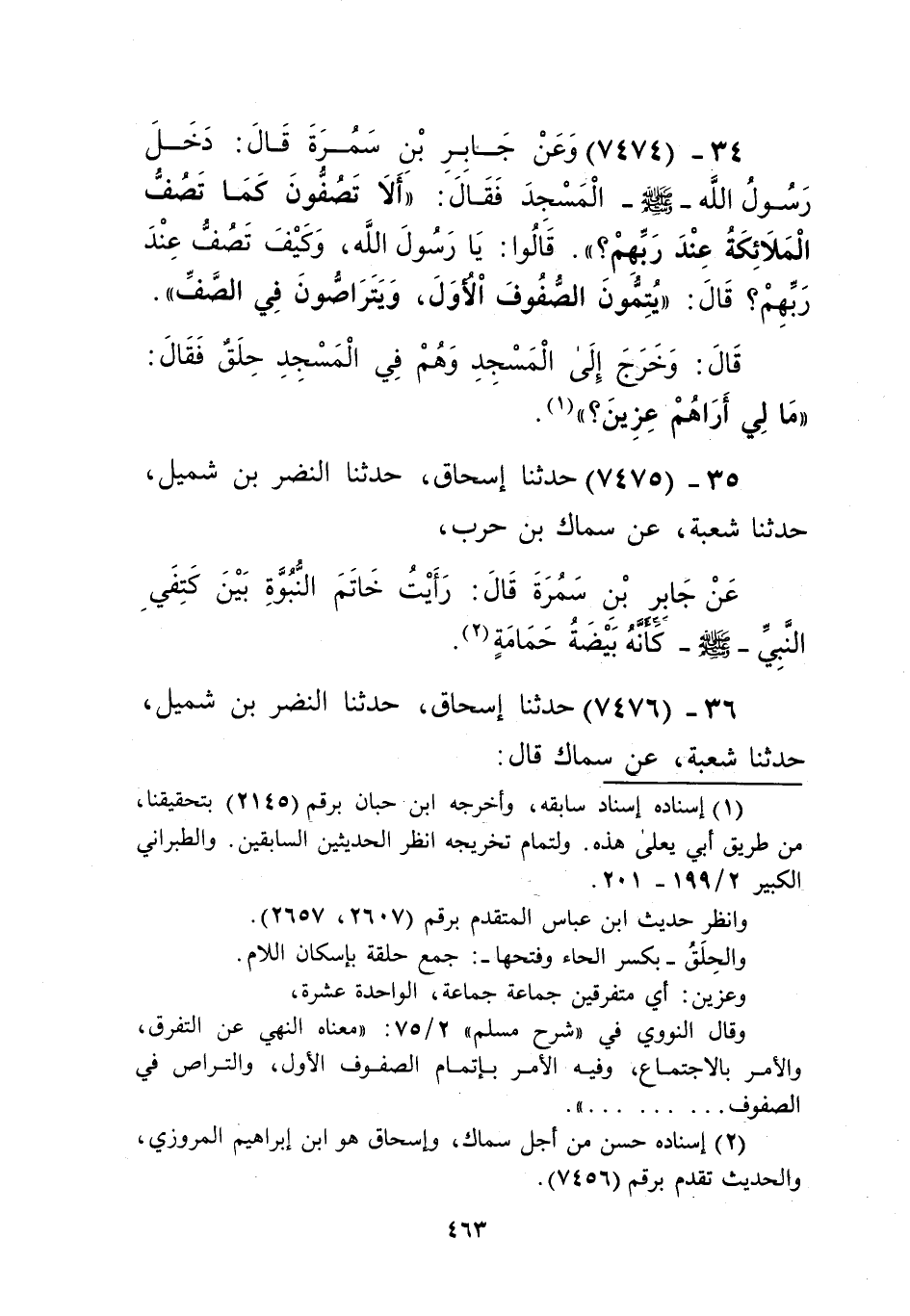 7474 - وَعَنْ جَابِرِ بْنِ سَمُرَةَ، قَالَ: دَخَلَ رَسُولُ اللَّهِ صَلَّى اللهُ عَلَيْهِ وَسَلَّمَ الْمَسْجِدَ، فَقَالَ: «§أَلَا تَصُفُّونَ كَمَا تَصُفُّ الْمَلَائِكَةُ عِنْدَ رَبِّهِمْ؟» قَالُوا: يَا رَسُولَ اللَّهِ، وَكَيْفَ تَصُفُّ عِنْدَ رَبِّهِمْ؟ قَالَ: «يُتِمُّونَ الصُّفُوفَ الْأُوَلَ، وَيَتَرَاصُّونَ فِي الصَّفِّ» قَالَ: وَخَرَجَ إِلَى الْمَسْجِدِ وَهُمْ فِي الْمَسْجِدِ حِلَقٌ، فَقَالَ: «مَا لِي أَرَاهُمْ عِزِينَ» Kإسناده صحيح