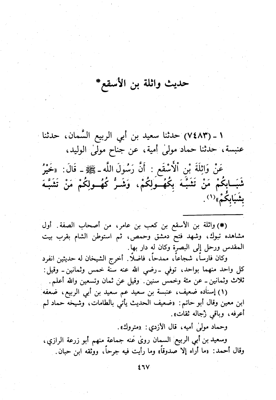 7483 - حَدَّثَنَا سَعِيدُ بْنُ أَبِي الرَّبِيعِ السَّمَّانُ، حَدَّثَنَا عَنْبَسَةُ، حَدَّثَنَا حَمَّادٌ، مَوْلَى أُمَيَّةَ، عَنْ جَنَاحٍ، مَوْلَى الْوَلِيدِ، عَنْ وَاثِلَةَ بْنِ الْأَسْقَعِ، أَنَّ رَسُولَ اللَّهِ صَلَّى اللهُ عَلَيْهِ وَسَلَّمَ قَالَ: «§خَيْرُ شَبَابِكُمْ مَنْ تَشَبَّهَ بِكُهُولِكُمْ، وَشَرُّ كُهُولِكُمْ مَنْ تَشَبَّهَ بِشَبَابِكُمْ» Kإسناده ضعيف