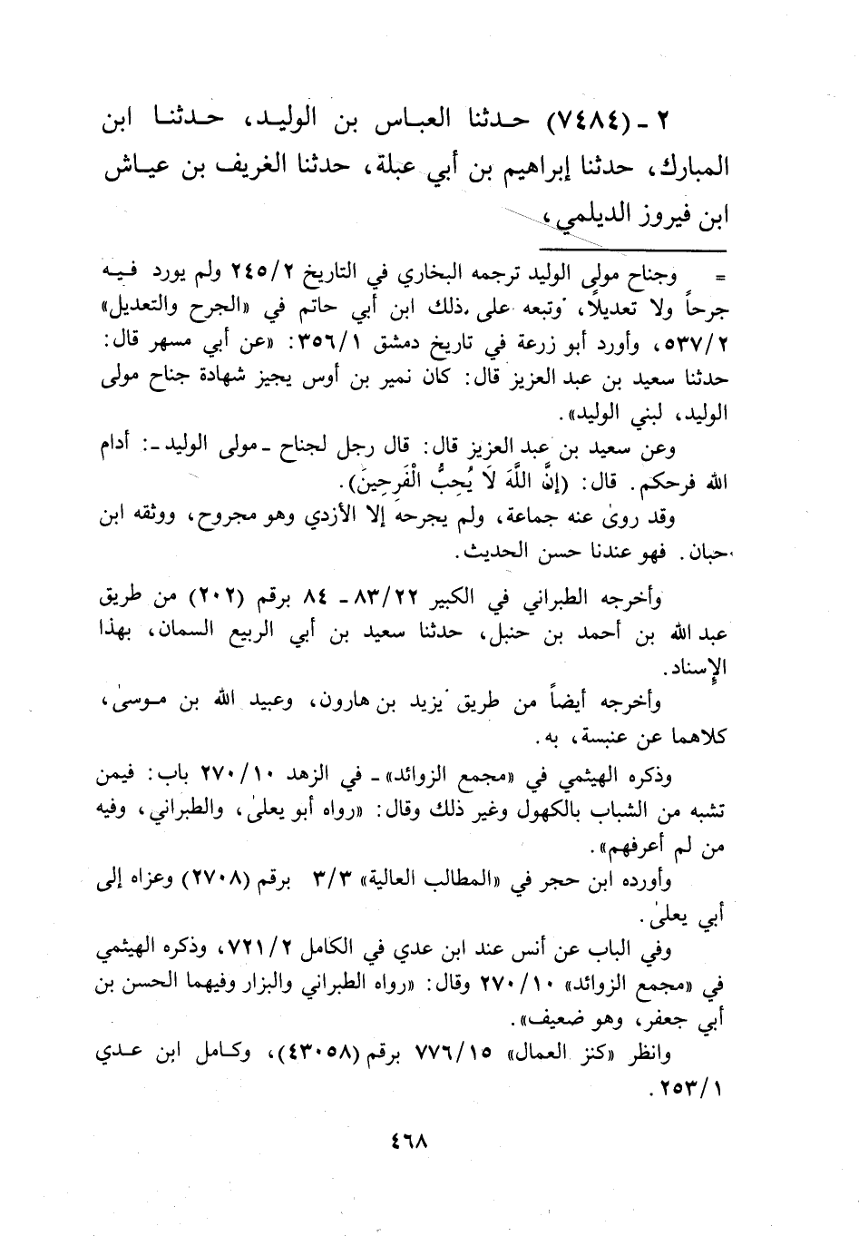 7484 - حَدَّثَنَا الْعَبَّاسُ بْنُ الْوَلِيدِ، حَدَّثَنَا ابْنُ الْمُبَارَكِ، حَدَّثَنَا إِبْرَاهِيمُ بْنُ أَبِي عَبْلَةَ، حَدَّثَنَا الْغَرِيفُ بْنُ عَيَّاشِ بْنِ فَيْرُوزَ الدَّيْلَمِيُّ، عَنْ وَاثِلَةَ بْنِ الْأَسْقَعِ، قَالَ: إِنَّ نَاسًا مِنْ بَنِي سُلَيْمٍ أَتَوُا النَّبِيَّ صَلَّى اللهُ عَلَيْهِ وَسَلَّمَ , فَقَالُوا: إِنَّ صَاحِبًا لَنَا قَدْ أَوْجَبَ، قَالَ: «§فَلْيَعْتِقْ رَقَبَةً يَفُكُّ اللَّهُ بِكُلِّ عُضْوٍ مِنْهَا عُضْوًا مِنْهُ مِنَ النَّارِ» Kإسناده جيد