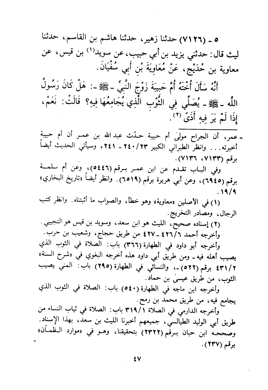 7126 - حَدَّثَنَا زُهَيْرٌ، حَدَّثَنَا هَاشِمُ بْنُ الْقَاسِمِ، حَدَّثَنَا لَيْثٌ، قَالَ: حَدَّثَنِي يَزِيدُ بْنُ أَبِي حَبِيبٍ، عَنْ سُوَيْدِ بْنِ قَيْسٍ، عَنْ مُعَاوِيَةَ بْنِ حُدَيْجٍ، عَنْ مُعَاوِيَةَ بْنِ أَبِي سُفْيَانَ، أَنَّهُ سَأَلَ أُخْتَهُ أُمَّ حَبِيبَةَ زَوْجَ النَّبِيِّ صَلَّى اللهُ عَلَيْهِ وَسَلَّمَ: هَلْ كَانَ رَسُولُ اللَّهِ صَلَّى اللهُ عَلَيْهِ وَسَلَّمَ §يُصَلِّي فِي الثَّوْبِ الَّذِي يُجَامِعُهَا فِيهِ؟ قَالَتْ: «نَعَمْ، إِذَا لَمْ يَرَ فِيهِ أَذًى» Kإسناده صحيح