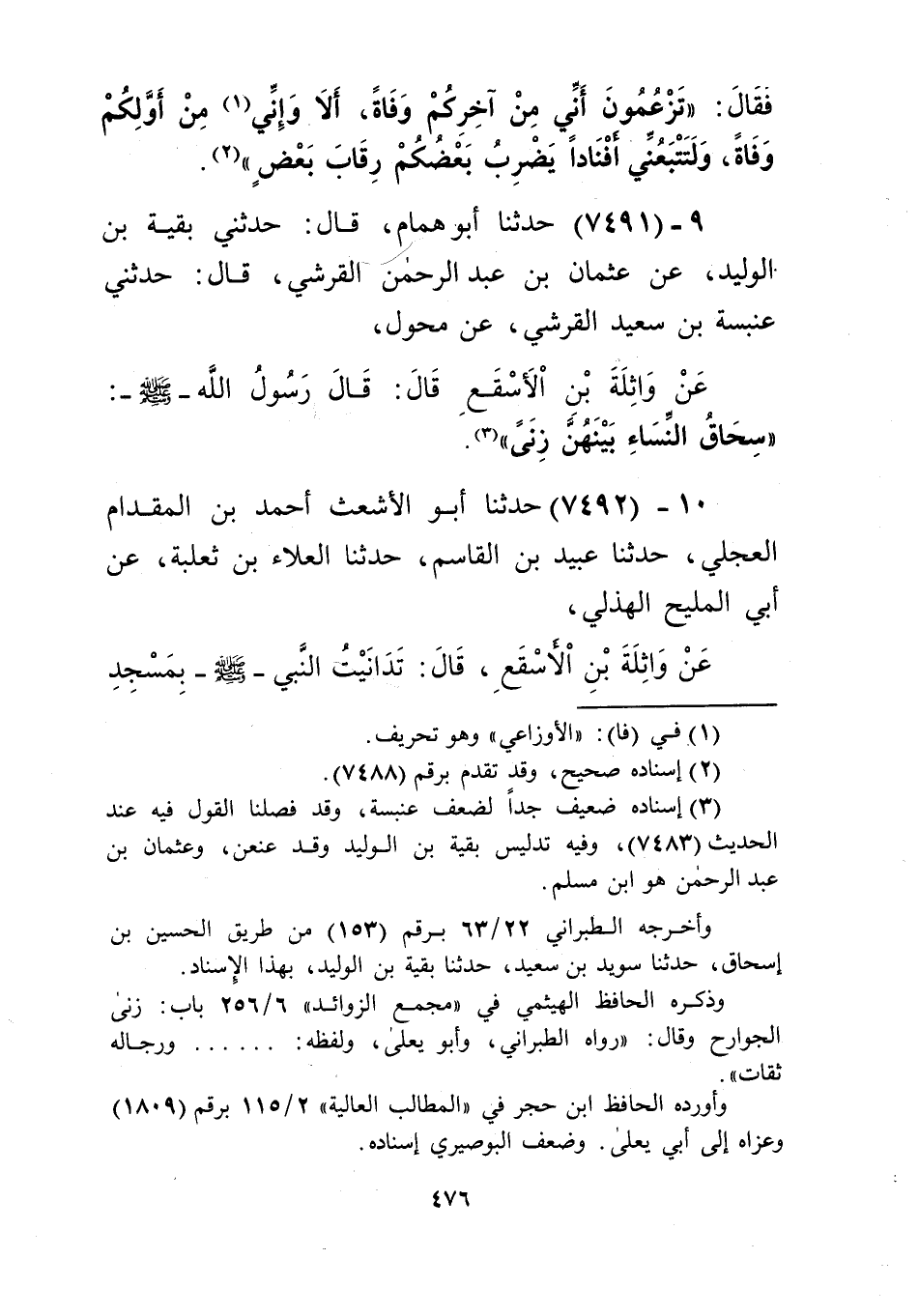 7491 - حَدَّثَنَا أَبُو هَمَّامٍ، قَالَ: حَدَّثَنِي بَقِيَّةُ بْنُ الْوَلِيدِ، عَنْ عُثْمَانَ بْنِ عَبْدِ الرَّحْمَنِ الْقُرَشِيِّ، قَالَ: حَدَّثَنِي عَنْبَسَةُ بْنُ سَعِيدٍ الْقُرَشِيُّ، عَنْ مَكْحُولٍ، عَنْ وَاثِلَةَ بْنِ الْأَسْقَعِ، قَالَ: قَالَ رَسُولُ اللَّهِ صَلَّى اللهُ عَلَيْهِ وَسَلَّمَ: «§سِحَاقُ النِّسَاءِ بَيْنَهُنَّ زِنًى» Kإسناده ضعيف جدا