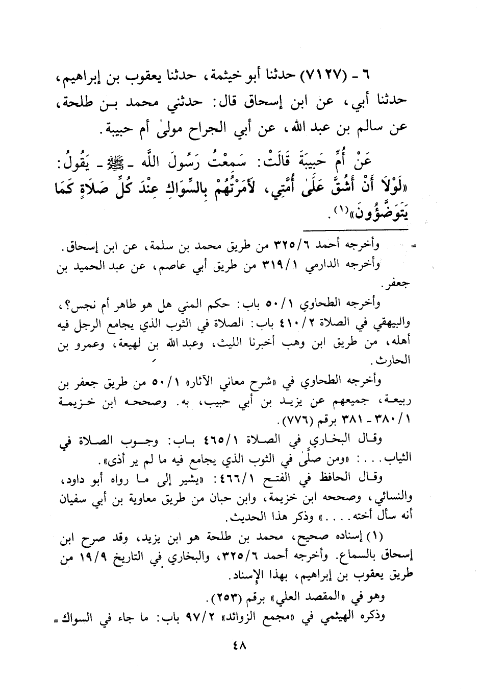 7127 - حَدَّثَنَا أَبُو خَيْثَمَةَ، حَدَّثَنَا يَعْقُوبُ بْنُ إِبْرَاهِيمَ، حَدَّثَنَا أَبِي، عَنِ ابْنِ إِسْحَاقَ قَالَ: حَدَّثَنِي مُحَمَّدُ بْنُ طَلْحَةَ، عَنْ سَالِمِ بْنِ عَبْدِ اللَّهِ، عَنْ أَبِي الْجَرَّاحِ، مَوْلَى أُمِّ حَبِيبَةَ، عَنْ أُمِّ حَبِيبَةَ قَالَتْ: سَمِعْتُ رَسُولَ اللَّهِ صَلَّى اللهُ عَلَيْهِ وَسَلَّمَ يَقُولُ: «§لَوْلَا أَنْ أَشُقَّ عَلَى أُمَّتِي لَأَمَرْتُهُمْ بِالسِّوَاكِ عِنْدَ كُلِّ صَلَاةٍ كَمَا يَتَوَضَّئُونَ» Kإسناده صحيح