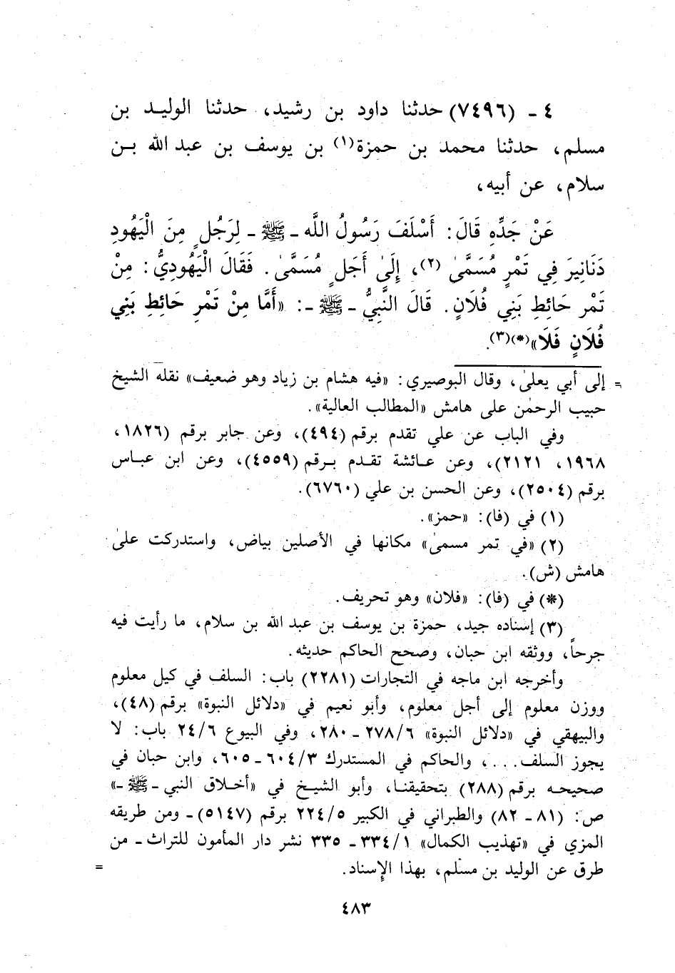 7496 - حَدَّثَنَا دَاوُدُ بْنُ رُشَيْدٍ، حَدَّثَنَا الْوَلِيدُ بْنُ مُسْلِمٍ، حَدَّثَنَا مُحَمَّدُ بْنُ حَمْزَةَ بْنِ يُوسُفَ بْنِ عَبْدِ اللَّهِ بْنِ سَلَامٍ، عَنْ أَبِيهِ، عَنْ جَدِّهِ، قَالَ: أَسْلَفَ رَسُولُ اللَّهِ صَلَّى اللهُ عَلَيْهِ وَسَلَّمَ لِرَجُلٍ مِنَ الْيَهُودِ دَنَانِيرَ فِي تَمْرٍ مُسَمًّى إِلَى أَجَلٍ مُسَمًّى، فَقَالَ الْيَهُودِيُّ: مِنْ تَمْرِ حَائِطِ بَنِي فُلَانٍ؟ قَالَ النَّبِيُّ صَلَّى اللهُ عَلَيْهِ وَسَلَّمَ: «§أَمَّا مِنْ تَمْرِ حَائِطِ بَنِي فُلَانٍ , فَلَا» Kإسناده جيد
