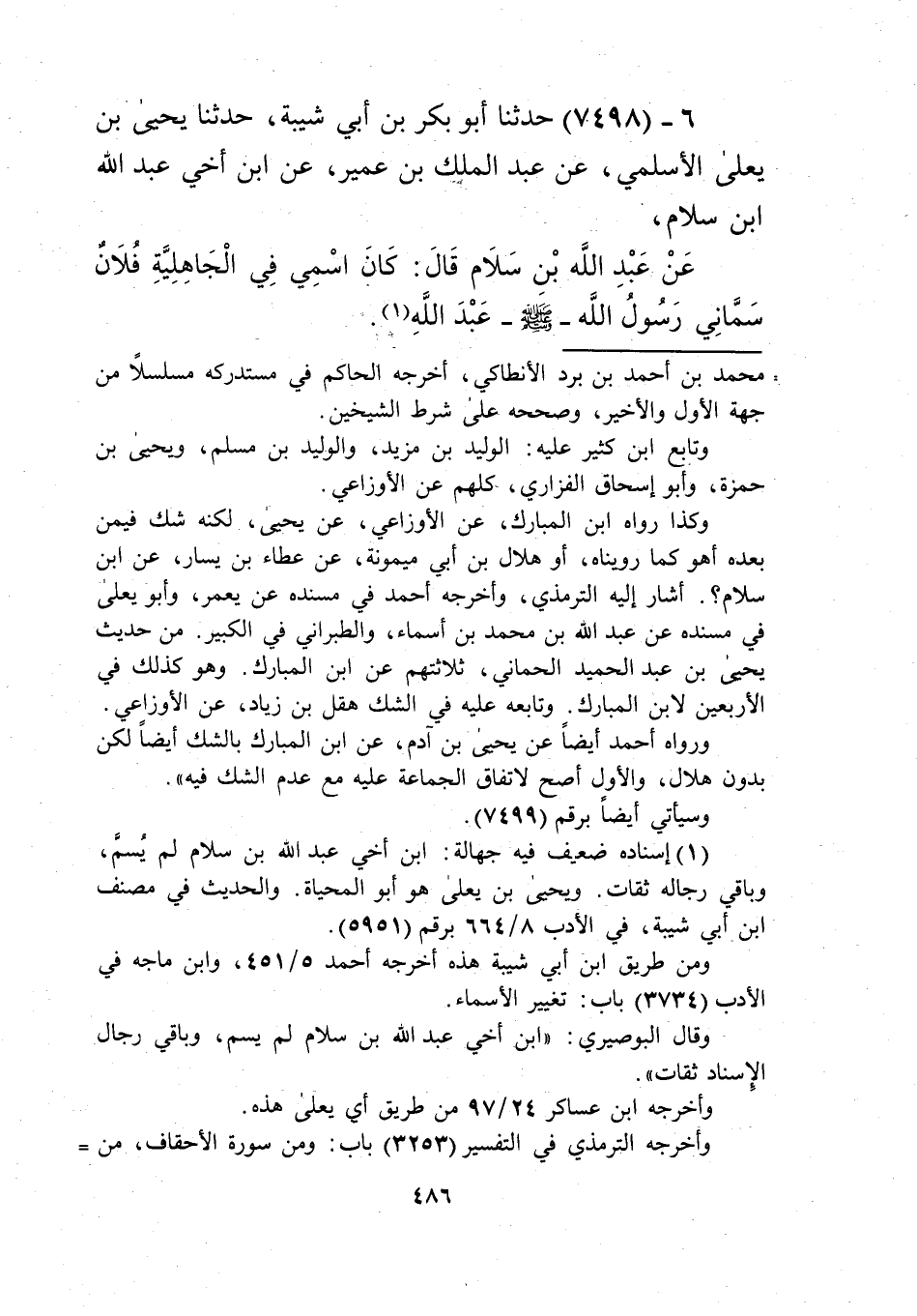7498 - حَدَّثَنَا أَبُو بَكْرِ بْنُ أَبِي شَيْبَةَ، حَدَّثَنَا يَحْيَى بْنُ يَعْلَى الْأَسْلَمِيُّ، عَنْ عَبْدِ الْمَلِكِ بْنِ عُمَيْرٍ، عَنِ ابْنِ أَخِي عَبْدِ اللَّهِ بْنِ سَلَامٍ، عَنْ عَبْدِ اللَّهِ بْنِ سَلَامٍ، قَالَ: «§كَانَ اسْمِيَ فِي الْجَاهِلِيَّةِ فُلَانٌ , سَمَّانِي رَسُولُ اللَّهِ صَلَّى اللهُ عَلَيْهِ وَسَلَّمَ عَبْدَ اللَّهِ» Kإسناده ضعيف