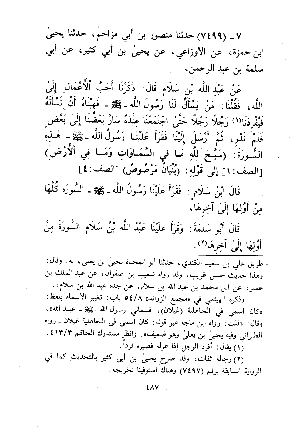 7499 - حَدَّثَنَا مَنْصُورُ بْنُ أَبِي مُزَاحِمٍ، حَدَّثَنَا يَحْيَى بْنُ حَمْزَةَ، عَنِ الْأَوْزَاعِيِّ، عَنْ يَحْيَى بْنِ أَبِي كَثِيرٍ، عَنْ أَبِي سَلَمَةَ بْنِ عَبْدِ الرَّحْمَنِ، عَنْ عَبْدِ اللَّهِ بْنِ سَلَامٍ، قَالَ: ذَكَرْنَا أَحَبَّ الْأَعْمَالِ إِلَى اللَّهِ، فَقُلْنَا: مَنْ يَسْأَلُ لَنَا رَسُولَ اللَّهِ صَلَّى اللهُ عَلَيْهِ وَسَلَّمَ؟ فَهِبْنَاهُ أَنْ نَسْأَلَهُ، فَيُفْرِدَنَا رَجُلًا رَجُلًا حَتَّى اجْتَمَعْنَا عِنْدَهُ، سَارَ بَعْضُنَا إِلَى بَعْضٍ، فَلَمْ نَدْرِ، ثُمَّ أَرْسَلَ إِلَيْنَا، فَقَرَأَ عَلَيْنَا رَسُولُ اللَّهِ صَلَّى اللهُ عَلَيْهِ وَسَلَّمَ هَذِهِ السُّورَةَ: " {§سَبَّحَ لِلَّهِ مَا فِي السَّمَوَاتِ وَمَا فِي الْأَرْضِ} إِلَى قَوْلِهِ {بُنْيَانٌ مَرْصُوصٌ} [الصف: 4] " قَالَ ابْنُ سَلَامٍ: فَقَرَأَ عَلَيْنَا رَسُولُ اللَّهِ صَلَّى اللهُ عَلَيْهِ وَسَلَّمَ السُّورَةَ كُلَّهَا مِنْ أَوَّلِهَا إِلَى آخِرِهَا قَالَ أَبُو سَلَمَةَ: وَقَرَأَ عَلَيْنَا عَبْدُ اللَّهِ بْنُ سَلَامٍ السُّورَةَ مِنْ أَوَّلِهَا إِلَى آخِرِهَاKرجاله ثقات