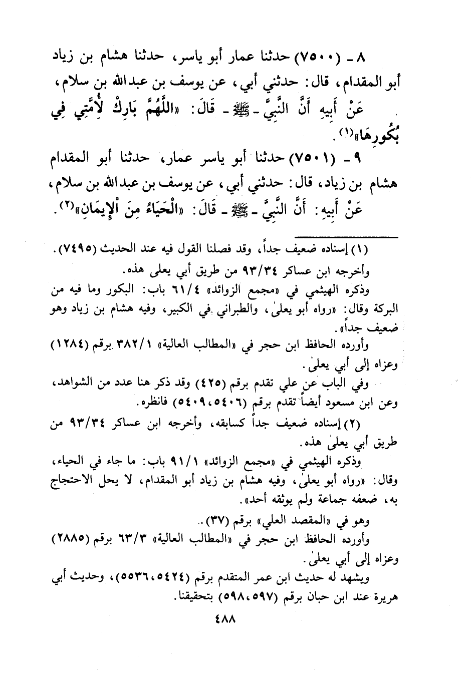 7501 - حَدَّثَنَا أَبُو يَاسِرٍ عَمَّارٌ، حَدَّثَنَا أَبُو الْمِقْدَامِ هِشَامُ بْنُ زِيَادٍ، قَالَ: حَدَّثَنِي أَبِي، عَنْ يُوسُفَ بْنِ عَبْدِ اللَّهِ بْنِ سَلَامٍ، عَنْ أَبِيهِ، أَنَّ النَّبِيَّ صَلَّى اللهُ عَلَيْهِ وَسَلَّمَ قَالَ: «§الْحَيَاءُ مِنَ الْإِيمَانِ» Kإسناده ضعيف جدا