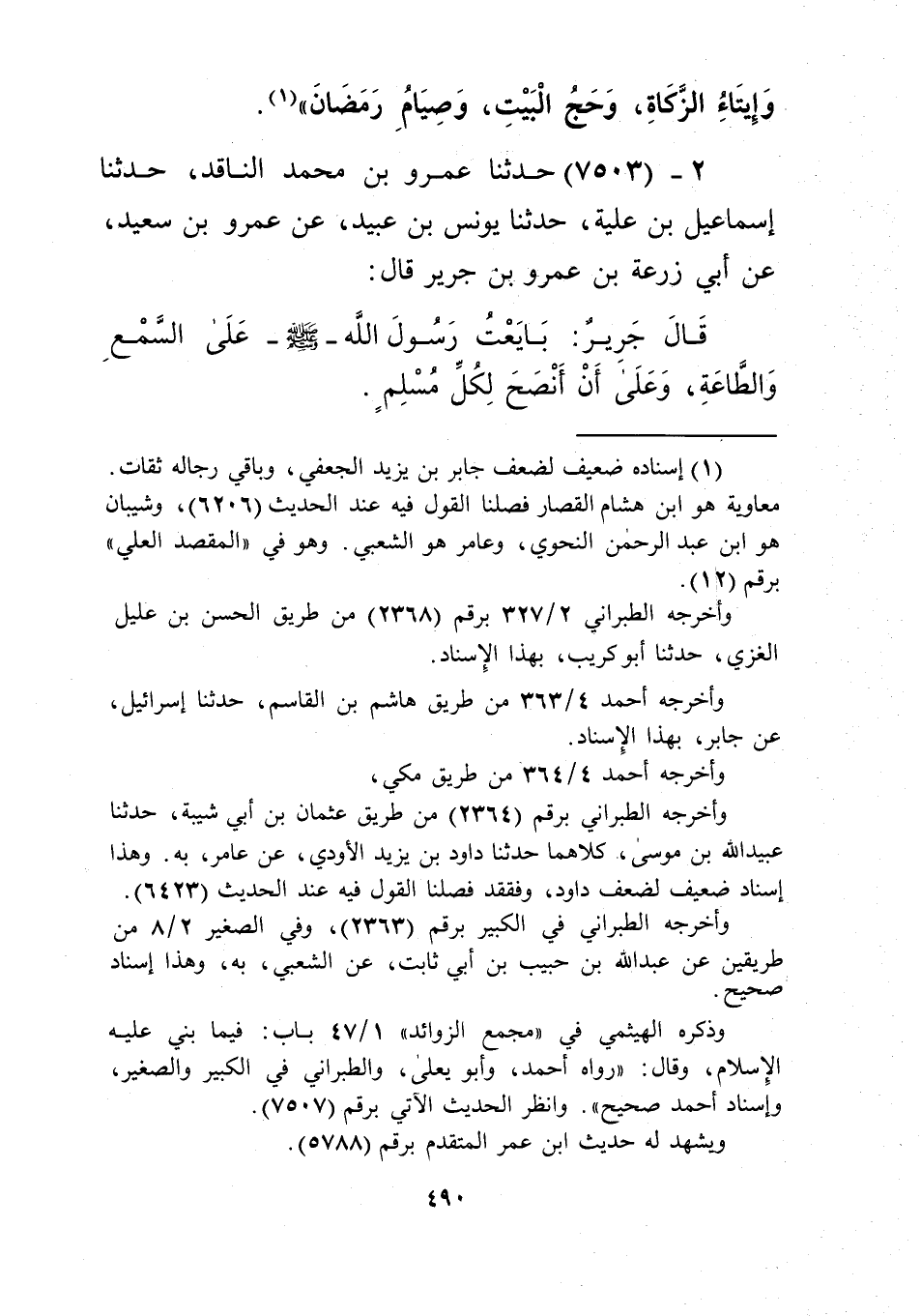 7503 - حَدَّثَنَا عَمْرُو بْنُ مُحَمَّدٍ النَّاقِدُ، حَدَّثَنَا إِسْمَاعِيلُ ابْنُ عُلَيَّةَ، حَدَّثَنَا يُونُسُ بْنُ عُبَيْدٍ، عَنْ عَمْرِو بْنِ سَعِيدٍ، عَنْ أَبِي زُرْعَةَ بْنِ عَمْرِو بْنِ جَرِيرٍ، قَالَ: قَالَ جَرِيرٌ: بَايَعْتُ رَسُولَ اللَّهِ صَلَّى اللهُ عَلَيْهِ وَسَلَّمَ عَلَى السَّمْعِ وَالطَّاعَةِ، وَعَلَى أَنْ أَنْصَحَ لِكُلِّ مُسْلِمٍ -[491]-، قَالَ: فَكَانَ إِذَا اشْتَرَى الشَّيْءَ كَانَ أَعْجَبَ إِلَيَّ مِنْ ثَمَنِهِ، قَالَ لِصَاحِبِهِ: «§وَاللَّهِ لَمَا نَأْخُذُ مِنْكَ أَحَبُّ إِلَيْنَا مِمَّا نُعْطِيكَ»، قَالَ: يُرِيدُ الْوَفَاءَ بِذَلِكَKإسناده صحيح