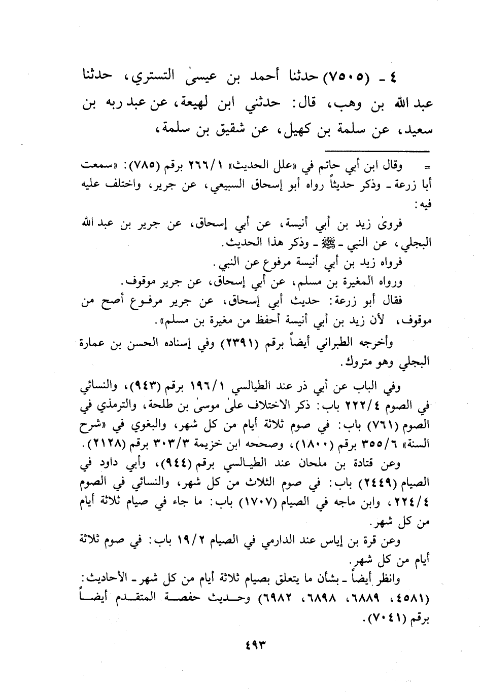 7505 - حَدَّثَنَا أَحْمَدُ بْنُ عِيسَى التُّسْتَرِيُّ، حَدَّثَنَا عَبْدُ اللَّهِ بْنُ وَهْبٍ، قَالَ: حَدَّثَنِي ابْنُ لَهِيعَةَ، عَنْ عَبْدِ رَبِّهِ بْنِ سَعِيدٍ، عَنْ سَلَمَةَ بْنِ كُهَيْلٍ، عَنْ شَقِيقِ بْنِ سَلَمَةَ -[494]-، عَنْ جَرِيرِ بْنِ عَبْدِ اللَّهِ الْبَجَلِيِّ، قَالَ: كَانَ رَسُولُ اللَّهِ صَلَّى اللهُ عَلَيْهِ وَسَلَّمَ إِذَا بَعَثَ سَرِيَّةً، قَالَ: «§بِسْمِ اللَّهِ، وَفِي سَبِيلِ اللَّهِ، وَعَلَى مِلَّةِ رَسُولِ اللَّهِ، لَا تَغُلُّوا، وَلَا تَغْدُرُوا، وَلَا تُمَثِّلُوا، وَلَا تَقْتُلُوا الْوِلْدَانَ» Kإسناده ضعيف