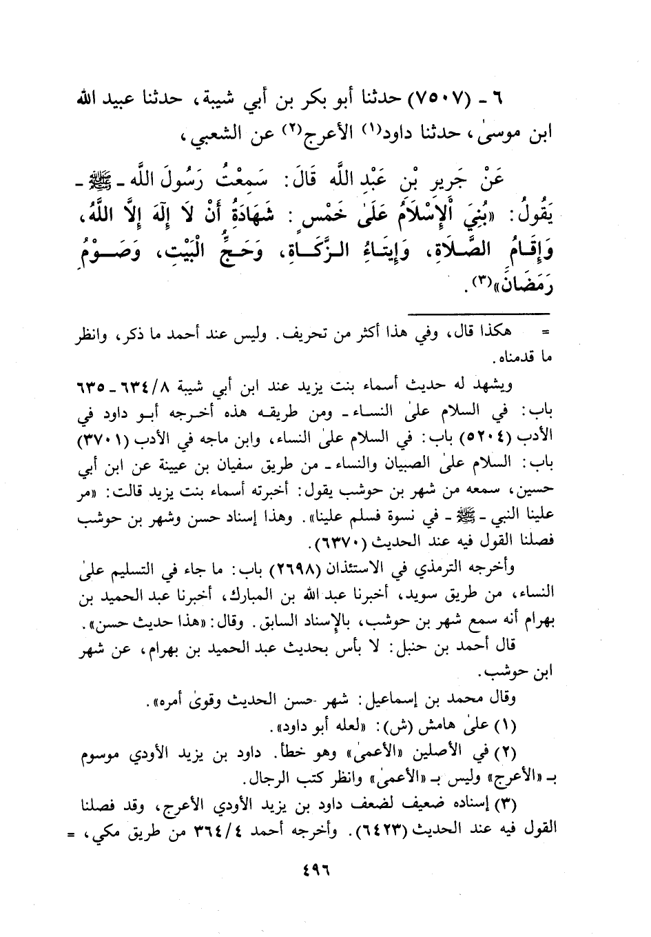 7507 - حَدَّثَنَا أَبُو بَكْرِ بْنُ أَبِي شَيْبَةَ، حَدَّثَنَا عُبَيْدُ اللَّهِ بْنُ مُوسَى، حَدَّثَنَا دَاوُدُ الْأَعْرَجُ، عَنِ الشَّعْبِيِّ، عَنْ جَرِيرِ بْنِ عَبْدِ اللَّهِ، قَالَ: سَمِعْتُ رَسُولَ اللَّهِ صَلَّى اللهُ عَلَيْهِ وَسَلَّمَ، يَقُولُ: " §بُنِي الْإِسْلَامُ عَلَى خَمْسٍ: شَهَادَةِ أَنْ لَا إِلَهَ إِلَّا اللَّهُ، وَإِقَامِ الصَّلَاةِ، وَإِيتَاءِ الزَّكَاةِ، وَحَجِّ الْبَيْتِ، وَصَوْمِ رَمَضَانَ "Kإسناده ضعيف