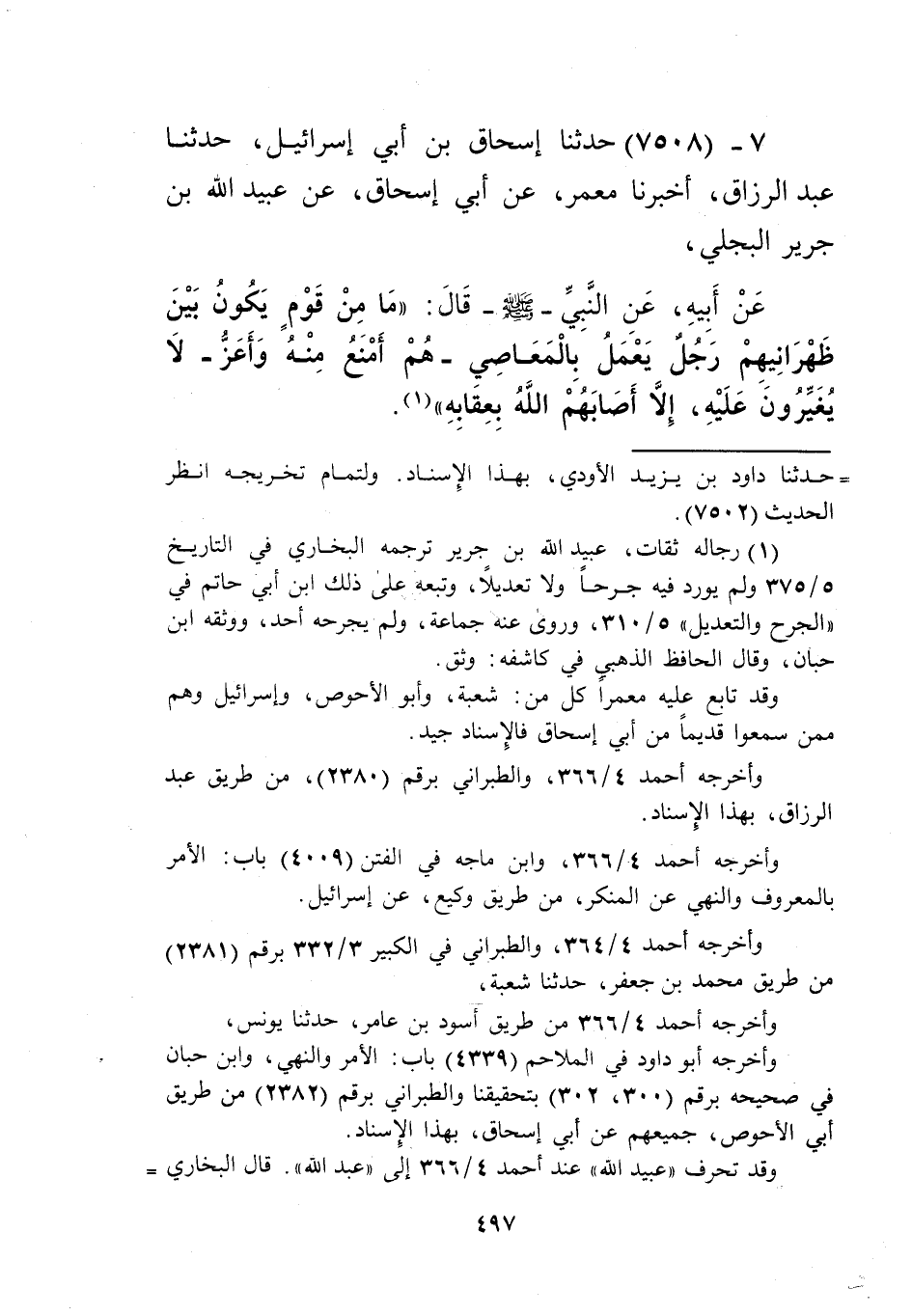 7508 - حَدَّثَنَا إِسْحَاقُ بْنُ أَبِي إِسْرَائِيلَ، حَدَّثَنَا عَبْدُ الرَّزَّاقِ، أَخْبَرَنَا مَعْمَرٌ، عَنْ أَبِي إِسْحَاقَ، عَنْ عُبَيْدِ اللَّهِ بْنِ جَرِيرٍ الْبَجَلِيِّ، عَنْ أَبِيهِ، عَنِ النَّبِيِّ صَلَّى اللهُ عَلَيْهِ وَسَلَّمَ قَالَ: «§مَا مِنْ قَوْمٍ يَكُونُ بَيْنَ ظَهْرَانِيهِمْ رَجُلٌ يَعْمَلُ بِالْمَعَاصِي هُمْ أَمْنَعُ مِنْهُ وَأَعَزُّ , لَا يُغَيِّرُونَ عَلَيْهِ إِلَّا أَصَابَهُمُ اللَّهُ بِعِقَابِهِ» Kرجاله ثقات