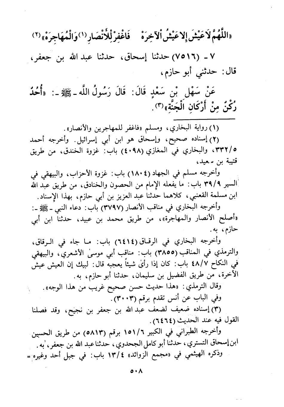 7516 - حَدَّثَنَا إِسْحَاقُ، حَدَّثَنَا عَبْدُ اللَّهِ بْنُ جَعْفَرٍ، قَالَ: حَدَّثَنِي أَبُو حَازِمٍ، عَنْ سَهْلِ بْنِ سَعْدٍ، قَالَ: قَالَ رَسُولُ اللَّهِ صَلَّى اللهُ عَلَيْهِ وَسَلَّمَ: «§أُحُدٌ رُكْنٌ مِنْ أَرْكَانِ الْجَنَّةِ» Kإسناده ضعيف