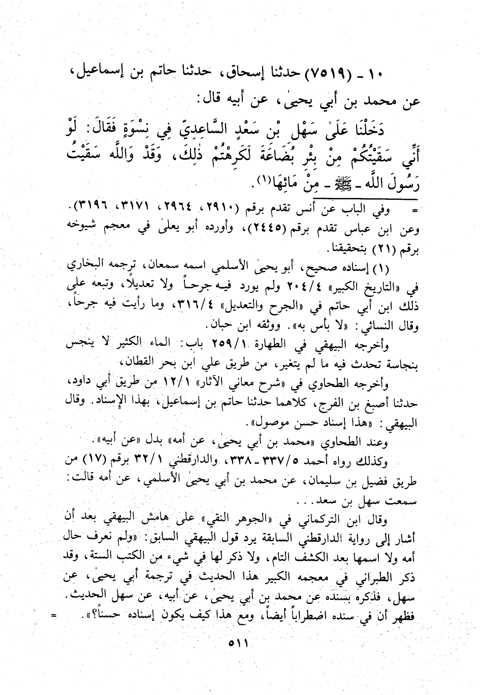 7519 - حَدَّثَنَا إِسْحَاقُ، حَدَّثَنَا حَاتِمُ بْنُ إِسْمَاعِيلَ، عَنْ مُحَمَّدِ بْنِ أَبِي يَحْيَى، عَنْ أَبِيهِ، قَالَ: دَخَلْنَا عَلَى سَهْلِ بْنِ سَعْدٍ السَّاعِدِيِّ فِي نِسْوَةٍ، فَقَالَ: «§لَوْ أَنِّي سَقَيْتُكُمْ مِنْ بِئْرِ بُضَاعَةَ لَكَرِهْتُمْ ذَلِكَ، وَقَدْ وَاللَّهِ سَقَيْتُ رَسُولَ اللَّهِ صَلَّى اللهُ عَلَيْهِ وَسَلَّمَ مِنْ مَائِهَا» Kإسناده صحيح