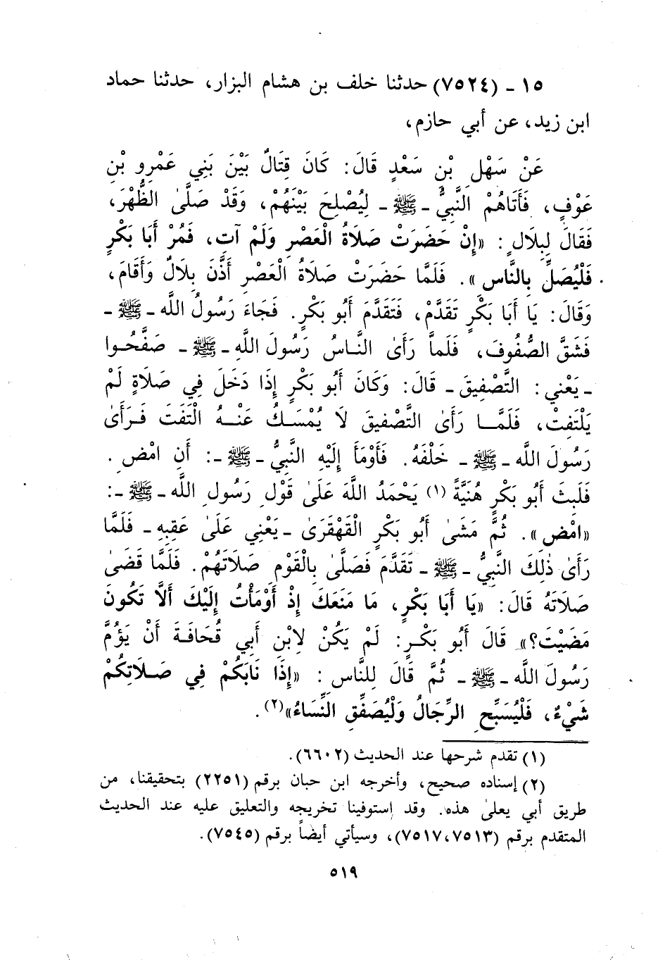 7524 - حَدَّثَنَا خَلَفُ بْنُ هِشَامٍ الْبَزَّارُ، حَدَّثَنَا حَمَّادُ بْنُ زَيْدٍ، عَنْ أَبِي حَازِمٍ، عَنْ سَهْلِ بْنِ سَعْدٍ، قَالَ: كَانَ قِتَالٌ بَيْنَ بَنِي عَمْرِو بْنِ عَوْفٍ، فَأَتَاهُمُ النَّبِيُّ صَلَّى اللهُ عَلَيْهِ وَسَلَّمَ لِيُصْلِحَ بَيْنَهُمْ، وَقَدْ صَلَّى الظُّهْرَ، فَقَالَ لِبِلَالٍ: «إِنْ حَضَرَتْ صَلَاةُ الْعَصْرِ وَلَمْ آتِ، فَمُرْ أَبَا بَكْرٍ فَلْيُصَلِّ بِالنَّاسِ» فَلَمَّا حَضَرَتْ صَلَاةُ الْعَصْرِ أَذَّنَ بِلَالٌ وَأَقَامَ، وَقَالَ: يَا أَبَا بَكْرٍ تَقَدَّمْ , فَتَقَدَّمَ أَبُو بَكْرٍ، فَجَاءَ رَسُولُ اللَّهِ صَلَّى اللهُ عَلَيْهِ وَسَلَّمَ، فَشَقَّ الصُّفُوفَ، فَلَمَّا رَأَى النَّاسُ رَسُولَ اللَّهِ صَلَّى اللهُ عَلَيْهِ وَسَلَّمَ صَفَّحُوا - يَعْنِي التَّصْفِيقَ - قَالَ: وَكَانَ أَبُو بَكْرٍ إِذَا دَخَلَ فِي صَلَاةٍ لَمْ يَلْتَفِتْ، فَلَمَّا رَأَى التَّصْفِيقَ لَا يُمْسِكُ عَنْهُ الْتَفَتَ، فَرَأَى رَسُولَ اللَّهِ صَلَّى اللهُ عَلَيْهِ وَسَلَّمَ خَلْفَهُ، فَأَوْمَأَ إِلَيْهِ النَّبِيُّ صَلَّى اللهُ عَلَيْهِ وَسَلَّمَ أَنِ امْضِ، فَلَبِثَ أَبُو بَكْرٍ هُنَيَّةً يَحْمَدُ اللَّهَ عَلَى قَوْلِ رَسُولِ اللَّهِ صَلَّى اللهُ عَلَيْهِ وَسَلَّمَ: «امْضِ» ثُمَّ مَشَى أَبُو بَكْرٍ الْقَهْقَرَى، يَعْنِي: عَلَى عَقِبِهِ، فَلَمَّا رَأَى ذَلِكَ النَّبِيُّ صَلَّى اللهُ عَلَيْهِ وَسَلَّمَ تَقَدَّمَ , فَصَلَّى بِالْقَوْمِ صَلَاتَهُمْ، فَلَمَّا قَضَى صَلَاتَهُ، قَالَ: «يَا أَبَا بَكْرٍ مَا مَنَعَكَ إِذْ أَوْمَأْتُ إِلَيْكَ أَلَّا تَكُونَ مَضَيْتَ» قَالَ أَبُو بَكْرٍ: لَمْ يَكُنْ لِابْنِ أَبِي قُحَافَةَ أَنْ يَؤُمَّ رَسُولَ اللَّهِ صَلَّى اللهُ عَلَيْهِ وَسَلَّمَ، ثُمَّ قَالَ لِلنَّاسِ: «§إِذَا نَابَكُمْ فِي صَلَاتِكُمْ شَيْءٌ فَلْيُسَبِّحِ الرِّجَالُ، وَلْيُصَفِّقِ النِّسَاءُ» Kإسناده صحيح