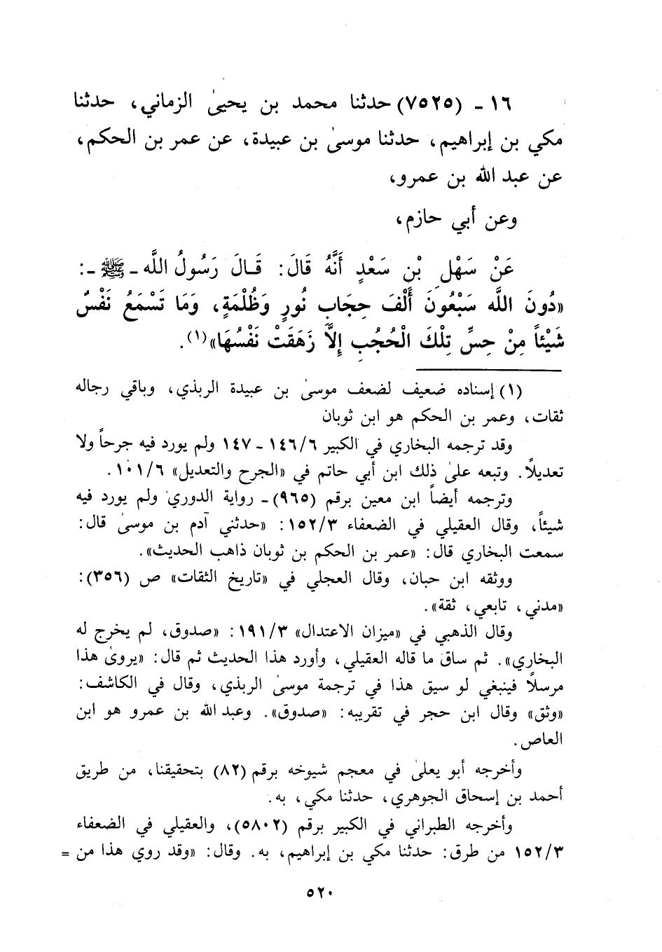 7525 - حَدَّثَنَا مُحَمَّدُ بْنُ يَحْيَى الزِّمَّانِيُّ، حَدَّثَنَا مَكِّيُّ بْنُ إِبْرَاهِيمَ، حَدَّثَنَا مُوسَى بْنُ عُبَيْدَةَ، عَنْ عُمَرَ بْنِ الْحَكَمِ، عَنْ عَبْدِ اللَّهِ بْنِ عَمْرٍو، وَعَنْ أَبِي حَازِمٍ، عَنْ سَهْلِ بْنِ سَعْدٍ، أَنَّهُ قَالَ: قَالَ رَسُولُ اللَّهِ صَلَّى اللهُ عَلَيْهِ وَسَلَّمَ: «§دُونَ اللَّهِ سَبْعُونَ أَلْفَ حِجَابِ نُورٍ وَظُلْمَةٍ، وَمَا تَسْمَعُ نَفْسٌ شَيْئًا مِنْ حِسِّ تِلْكَ الْحُجُبِ إِلَّا زَهَقَتْ نَفْسُهَا» Kإسناده ضعيف