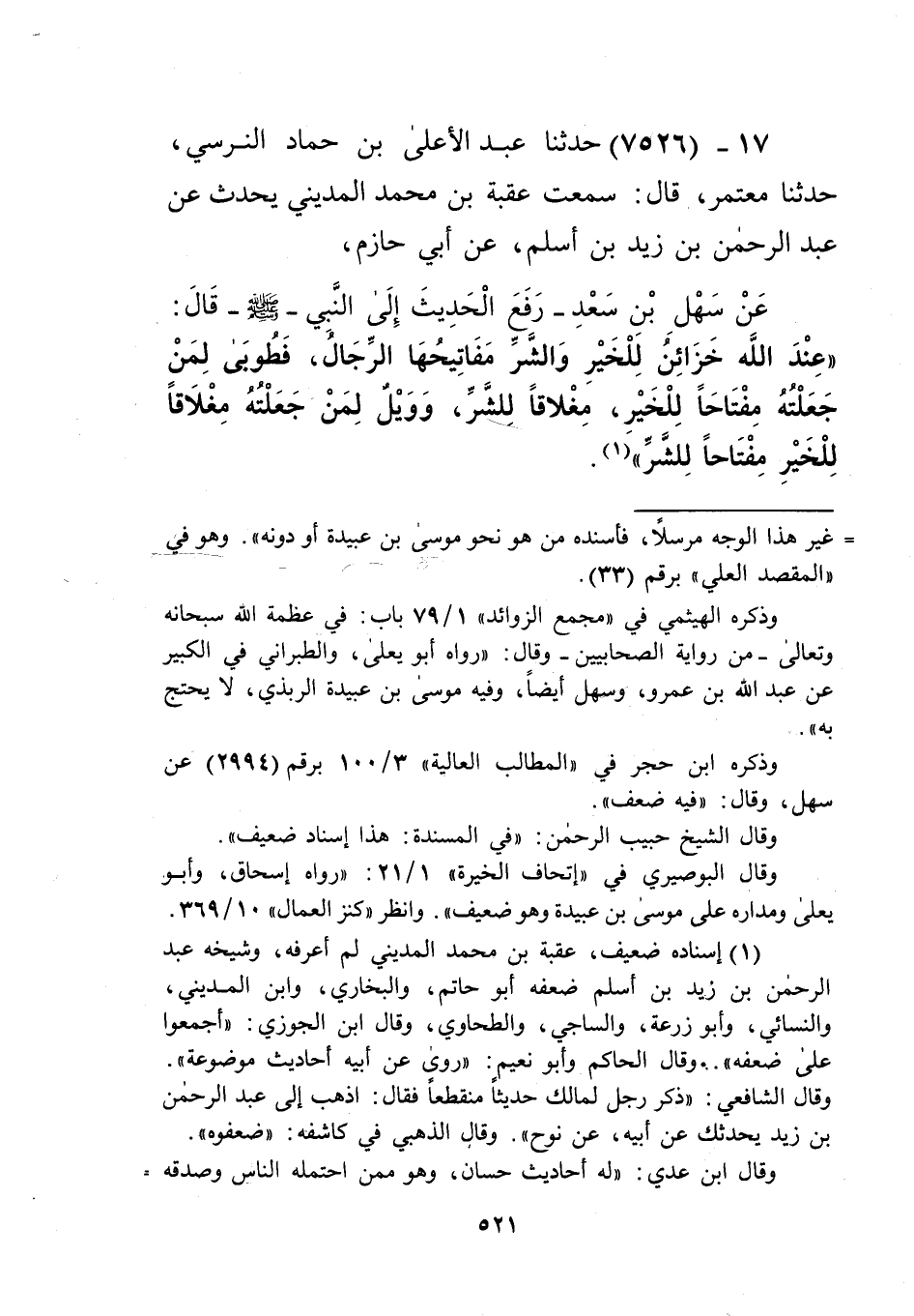 7526 - حَدَّثَنَا عَبْدُ الْأَعْلَى بْنُ حَمَّادٍ النَّرْسِيُّ، حَدَّثَنَا مُعْتَمِرٌ، قَالَ: سَمِعْتُ عُقْبَةَ بْنَ مُحَمَّدٍ الْمَدِينِيَّ يُحَدِّثُ، عَنْ عَبْدِ الرَّحْمَنِ بْنِ زَيْدِ بْنِ أَسْلَمَ، عَنْ أَبِي حَازِمٍ، عَنْ سَهْلِ بْنِ سَعْدٍ، رَفَعَ الْحَدِيثَ إِلَى النَّبِيِّ صَلَّى اللهُ عَلَيْهِ وَسَلَّمَ، قَالَ: «§عِنْدَ اللَّهِ خَزَائِنُ لِلْخَيْرِ وَالشَّرِّ , مَفَاتِيحُهَا الرِّجَالُ، فَطُوبَى لِمَنْ جَعَلْتَهُ مِفْتَاحًا لِلْخَيْرِ مِغْلَاقًا لِلشَّرِّ، وَوَيْلٌ لِمَنْ جَعَلْتَهُ مِغْلَاقًا لِلْخَيْرِ مِفْتَاحًا لِلشَّرِّ» Kإسناده ضعيف