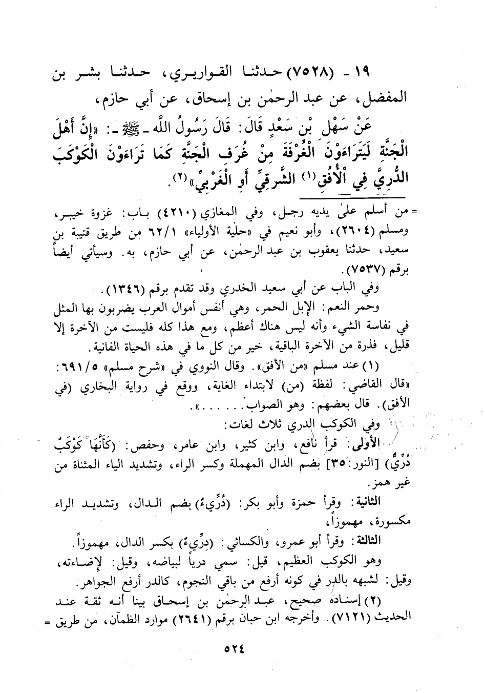 7528 - حَدَّثَنَا الْقَوَارِيرِيُّ، حَدَّثَنَا بِشْرُ بْنُ الْمُفَضَّلِ، عَنْ عَبْدِ الرَّحْمَنِ بْنِ إِسْحَاقَ، عَنْ أَبِي حَازِمٍ، عَنْ سَهْلِ بْنِ سَعْدٍ، قَالَ: قَالَ رَسُولُ اللَّهِ صَلَّى اللهُ عَلَيْهِ وَسَلَّمَ: «إِنَّ §أَهْلَ الْجَنَّةِ لَيَتَرَاءَوْنَ الْغُرْفَةَ مِنْ غُرَفِ الْجَنَّةِ كَمَا تَرَاءَوْنَ الْكَوْكَبَ الدُّرِّيَّ فِي الْأُفُقِ الشَّرْقِيِّ أَوِ الْغَرْبِيِّ» Kإسناده صحيح