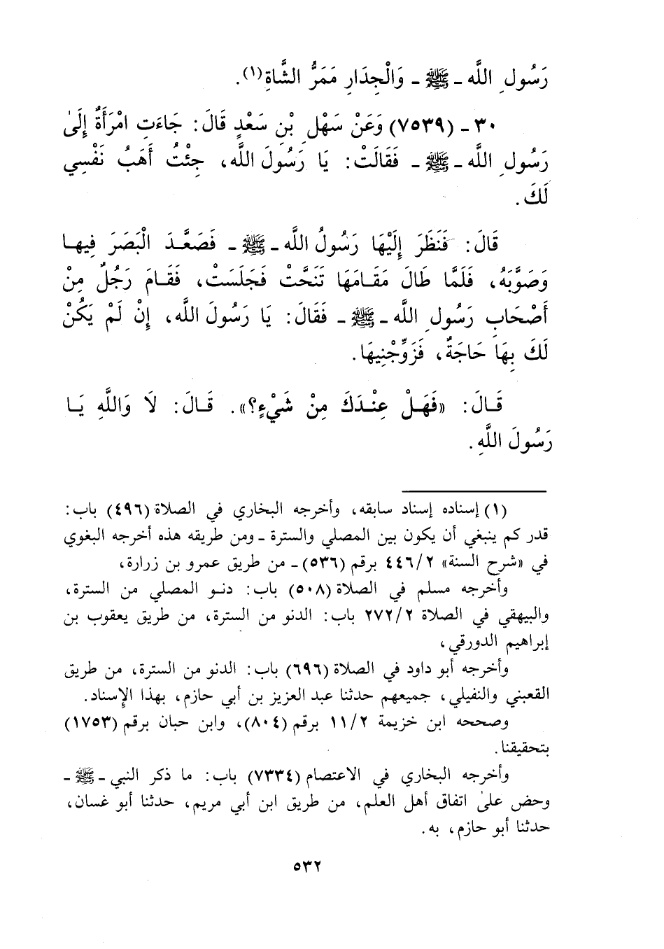 7539 - وَعَنْ سَهْلِ بْنِ سَعْدٍ، قَالَ: جَاءَتِ امْرَأَةٌ إِلَى رَسُولِ اللَّهِ صَلَّى اللهُ عَلَيْهِ وَسَلَّمَ , فَقَالَتْ: يَا رَسُولَ اللَّهِ , جِئْتُ أَهَبُ نَفْسِيَ لَكَ، قَالَ: فَنَظَرَ إِلَيْهَا رَسُولُ اللَّهِ صَلَّى اللهُ عَلَيْهِ وَسَلَّمَ , فَصَعَّدَ الْبَصَرَ فِيهَا وَصَوَّبَهُ، فَلَمَّا طَالَ مَقَامُهَا تَنَحَّتْ، فَجَلَسَتْ، فَقَامَ رَجُلٌ مِنْ أَصْحَابِ رَسُولِ اللَّهِ صَلَّى اللهُ عَلَيْهِ وَسَلَّمَ، فَقَالَ: يَا رَسُولَ اللَّهِ، إِنْ لَمْ يَكُنْ لَكَ بِهَا حَاجَةٌ فَزَوِّجْنِيهَا، قَالَ: «فَهَلْ عِنْدَكَ مِنْ شَيْءٍ؟» قَالَ: لَا وَاللَّهِ يَا رَسُولَ اللَّهِ، قَالَ: «فَاذْهَبْ»، فَذَهَبَ , ثُمَّ رَجَعَ، فَقَالَ: مَا وَجَدْتُ شَيْئًا، قَالَ: «اذْهَبْ فَانْظُرْ وَلَوْ خَاتَمٌ مِنْ حَدِيدٍ» , قَالَ: فَذَهَبَ ثُمَّ رَجَعَ، فَقَالَ: يَا رَسُولَ اللَّهِ، لَا، وَلَا خَاتَمٌ مِنْ حَدِيدٍ، هَذَا إِزَارِي وَمَا لَهُ رِدَاءٌ , أُصْدِقُهَا إِيَّاهُ، فَقَالَ: «إِزَارُكَ إِنْ لَبِسَتْهُ لَمْ يَكُنْ عَلَيْكَ مِنْهُ شَيْءٌ، وَإِنْ لَبِسْتَهُ لَمْ يَكُنْ عَلَيْهَا مِنْهُ شَيْءٌ» قَالَ: فَلَمَّا طَالَ مَجْلِسُهُ قَامَ , فَرَآهُ رَسُولُ اللَّهِ صَلَّى اللهُ عَلَيْهِ وَسَلَّمَ مُوَلِّيًا , فَأَمَرَ بِهِ , فَدُعِيَ، فَقَالَ: «مَاذَا مَعَكَ مِنَ الْقُرْآنِ؟» قَالَ: مَعِي سُورَةُ كَذَا , وَسُورَةُ كَذَا مِنَ السُّوَرِ , عَدَّدَهَا، فَقَالَ: «اذْهَبْ §فَقَدْ مَلَّكْتُكَهَا بِمَا مَعَكَ مِنَ الْقُرْآنِ» Kإسناده صحيح