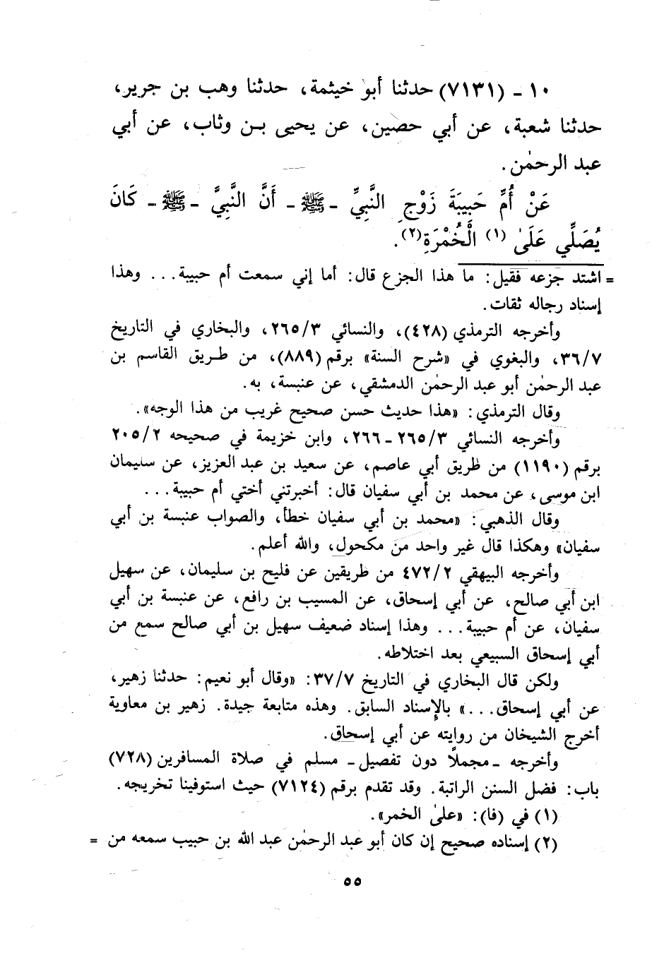 7131 - حَدَّثَنَا أَبُو خَيْثَمَةَ، حَدَّثَنَا وَهْبُ بْنُ جَرِيرٍ، حَدَّثَنَا شُعْبَةُ، عَنْ أَبِي حَصِينٍ، عَنْ يَحْيَى بْنِ وَثَّابَ، عَنْ أَبِي عَبْدِ الرَّحْمَنِ، عَنْ أُمِّ حَبِيبَةَ، زَوْجِ النَّبِيِّ صَلَّى اللهُ عَلَيْهِ وَسَلَّمَ، «أَنَّ النَّبِيَّ صَلَّى اللهُ عَلَيْهِ وَسَلَّمَ كَانَ §يُصَلِّي عَلَى الْخُمْرَةِ» Kإسناده صحيح