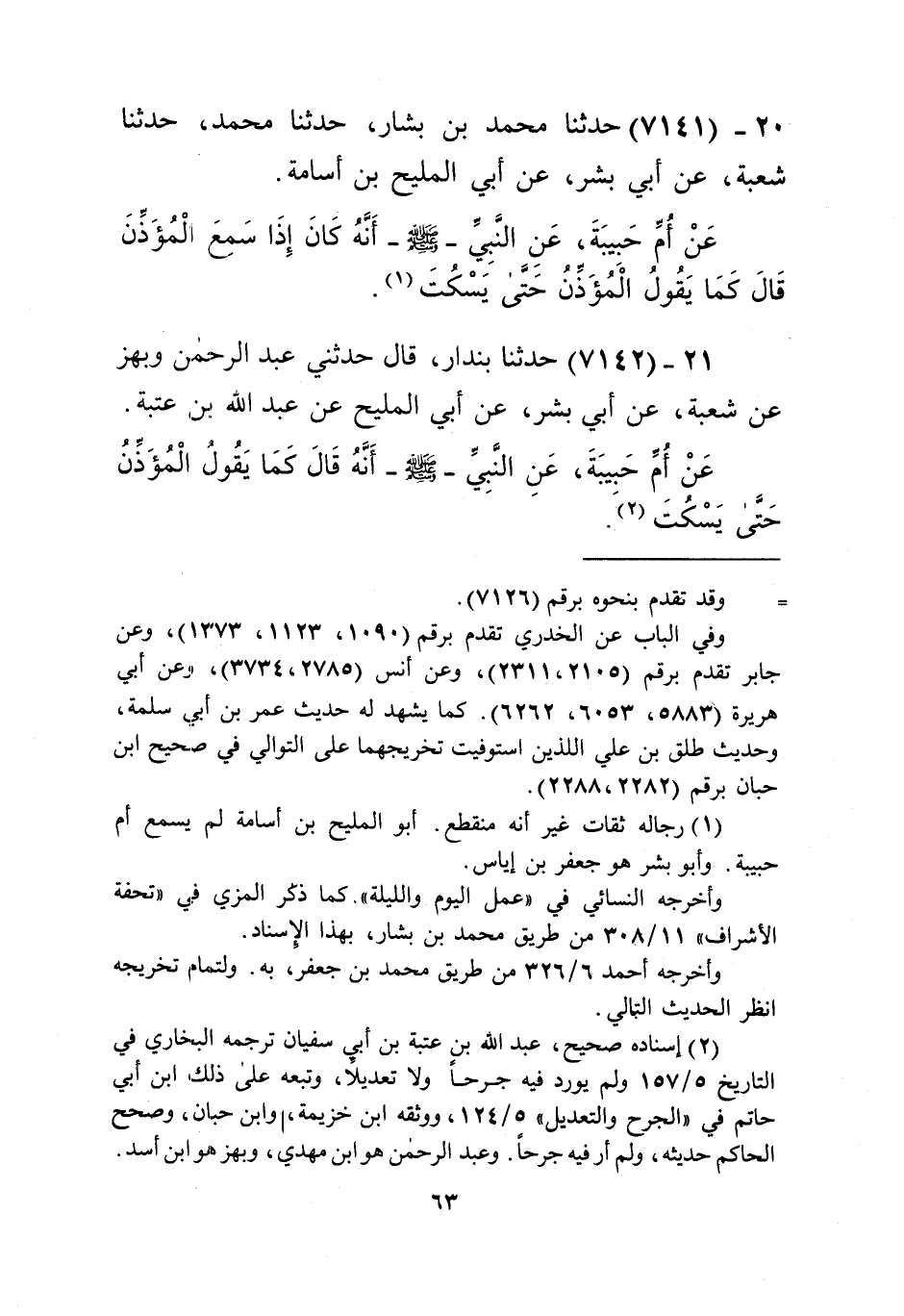 7142 - حَدَّثَنَا بُنْدَارٌ، قَالَ: حَدَّثَنِي عَبْدُ الرَّحْمَنِ، وَبَهْزٌ، عَنْ شُعْبَةَ، عَنْ أَبِي بِشْرٍ، عَنْ أَبِي الْمَلِيحِ، عَنْ عَبْدِ اللَّهِ بْنِ عُتْبَةَ، عَنْ أُمِّ حَبِيبَةَ، عَنِ النَّبِيِّ صَلَّى اللهُ عَلَيْهِ وَسَلَّمَ، أَنَّهُ «§قَالَ كَمَا يَقُولُ الْمُؤَذِّنُ حَتَّى يَسْكُتَ» Kإسناده صحيح