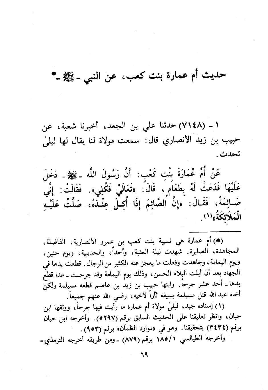 7148 - حَدَّثَنَا عَلِيُّ بْنُ الْجَعْدِ، أَخْبَرَنَا شُعْبَةُ، عَنْ حَبِيبِ بْنِ زَيْدٍ الْأَنْصَارِيِّ قَالَ: سَمِعْتُ مَوْلَاةً لَنَا يُقَالُ لَهَا: لَيْلَى تُحَدِّثُ، عَنْ أُمِّ عُمَارَةَ بِنْتِ كَعْبٍ، أَنَّ رَسُولَ اللَّهِ صَلَّى اللهُ عَلَيْهِ وَسَلَّمَ دَخَلَ عَلَيْهَا، فَدَعَتْ لَهُ بِطَعَامٍ، قَالَ: «تَعَالَيْ , فَكُلِي»، فَقَالَتْ: إِنِّي صَائِمَةٌ، فَقَالَ: «إِنَّ §الصَّائِمَ إِذَا أُكِلَ عِنْدَهُ صَلَّتْ عَلَيْهِ الْمَلَائِكَةُ» Kإسناده جيد