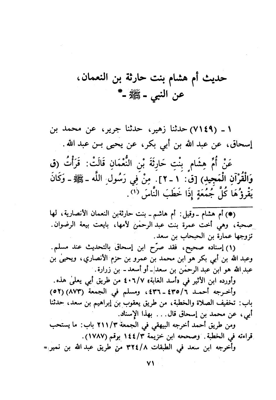 7149 - حَدَّثَنَا زُهَيْرٌ، حَدَّثَنَا جَرِيرٌ، عَنْ مُحَمَّدِ بْنِ إِسْحَاقَ، عَنْ عَبْدِ اللَّهِ بْنِ أَبِي بَكْرٍ، عَنْ يَحْيَى بْنِ عَبْدِ اللَّهِ، عَنْ أُمِّ هِشَامٍ بِنْتِ حَارِثَةَ بْنِ النُّعْمَانِ قَالَتْ: «§قَرَأْتُ ق وَالْقُرْآنِ الْمَجِيدِ مِنْ فِي رَسُولِ اللَّهِ صَلَّى اللهُ عَلَيْهِ وَسَلَّمَ، وَكَانَ يَقْرَؤُهَا كُلَّ جُمُعَةٍ إِذَا خَطَبَ النَّاسَ» Kإسناده صحيح