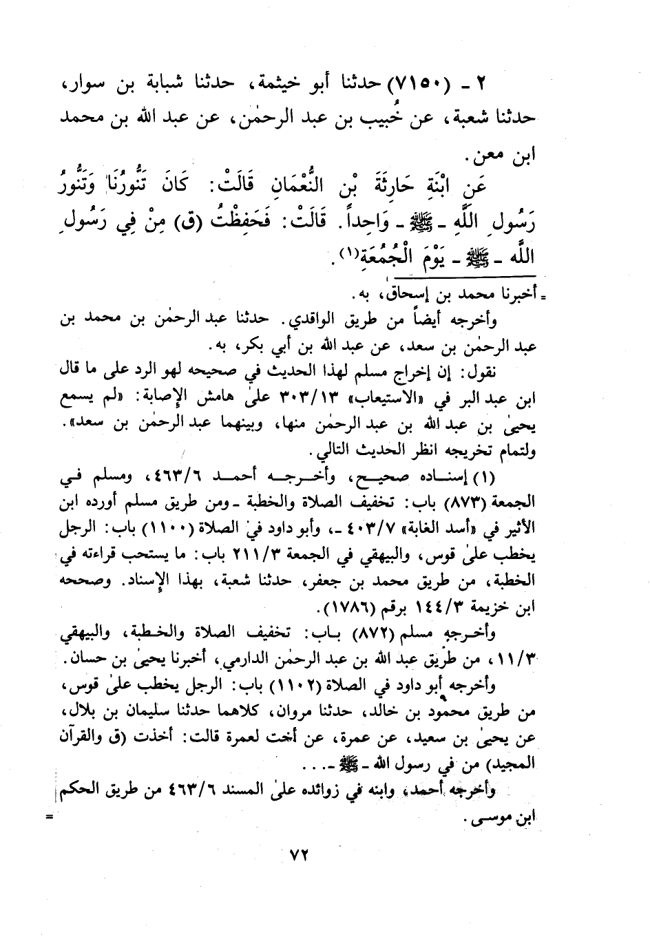 7150 - حَدَّثَنَا أَبُو خَيْثَمَةَ، حَدَّثَنَا شَبَابَةُ بْنُ سَوَّارٍ، حَدَّثَنَا شُعْبَةُ، عَنْ خُبَيْبِ بْنِ عَبْدِ الرَّحْمَنِ، عَنْ عَبْدِ اللَّهِ بْنِ مُحَمَّدِ بْنِ مَعْنٍ، عَنِ ابْنَةِ حَارِثَةَ بْنِ النُّعْمَانِ قَالَتْ: «كَانَ تَنُّورُنَا وَتَنُّورُ رَسُولِ اللَّهِ صَلَّى اللهُ عَلَيْهِ وَسَلَّمَ وَاحِدًا»، قَالَتْ: «§فَحَفِظْتُ ق مِنْ فِي رَسُولِ اللَّهِ صَلَّى اللهُ عَلَيْهِ وَسَلَّمَ يَوْمَ الْجُمُعَةِ» Kإسناده صحيح