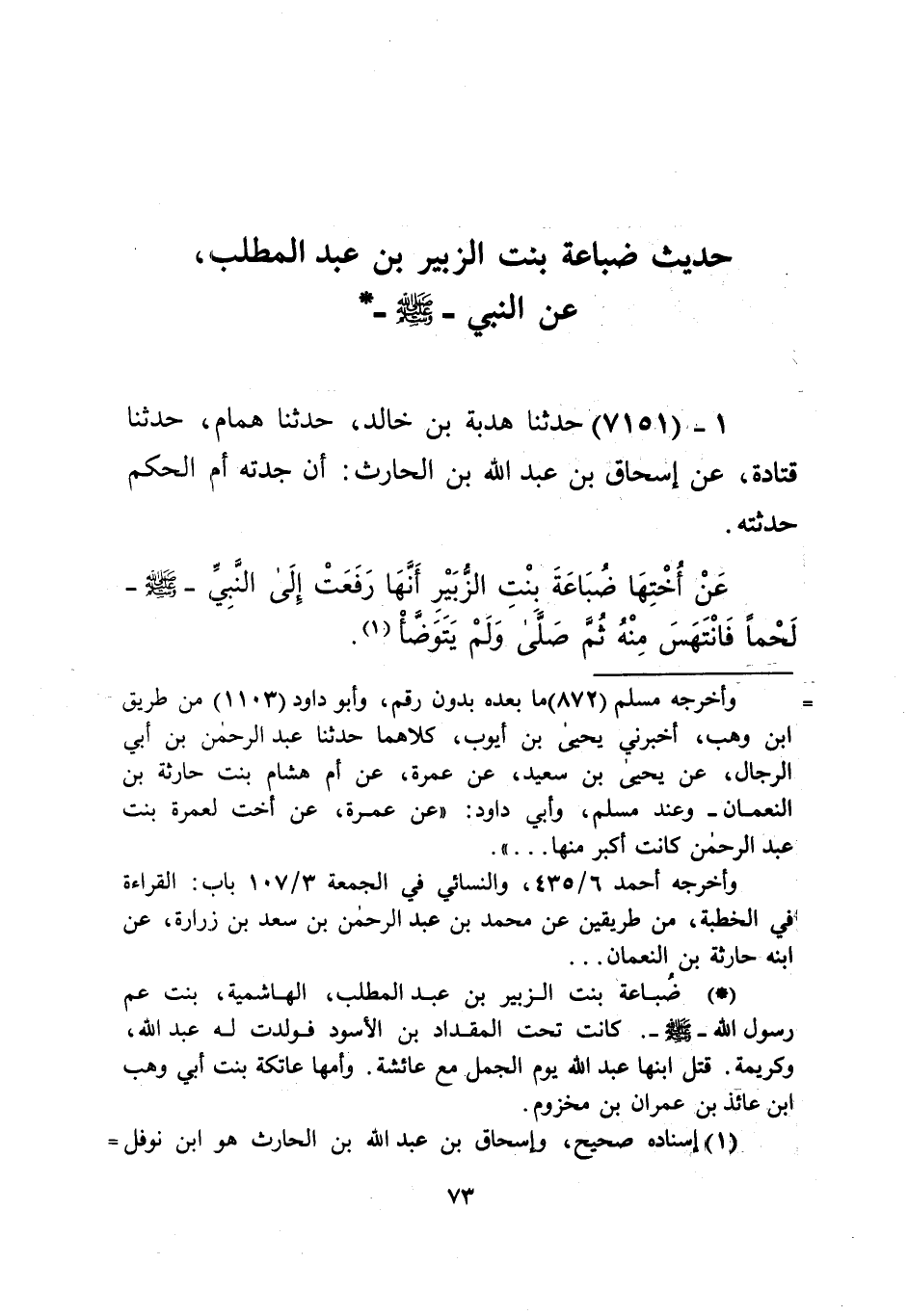 7151 - حَدَّثَنَا هُدْبَةُ بْنُ خَالِدٍ، حَدَّثَنَا هَمَّامٌ، حَدَّثَنَا قَتَادَةُ، عَنْ إِسْحَاقَ بْنِ عَبْدِ اللَّهِ بْنِ الْحَارِثِ، أَنَّ جَدَّتَهُ أُمَّ الْحَكَمِ حَدَّثَتْهُ، عَنْ أُخْتِهَا ضُبَاعَةَ بِنْتِ الزُّبَيْرِ: «أَنَّهَا §رَفَعَتْ إِلَى النَّبِيِّ صَلَّى اللهُ عَلَيْهِ وَسَلَّمَ لَحْمًا فَانْتَهَسَ مِنْهُ، ثُمَّ صَلَّى , وَلَمْ يَتَوَضَّأْ» Kإسناده صحيح