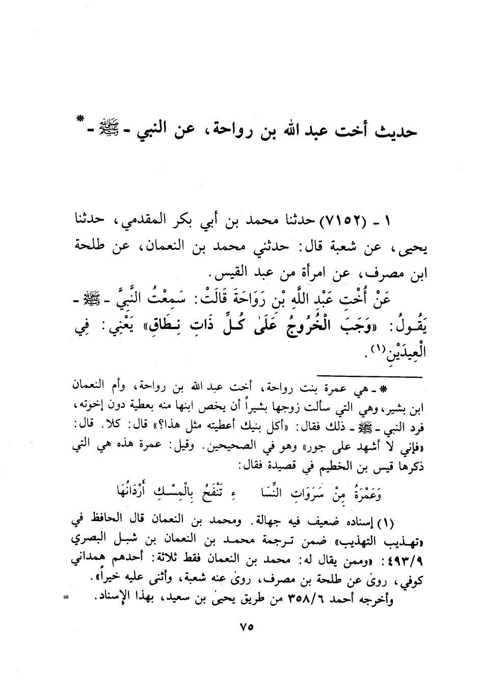 7152 - حَدَّثَنَا مُحَمَّدُ بْنُ أَبِي بَكْرٍ الْمُقَدَّمِيُّ، حَدَّثَنَا يَحْيَى، عَنْ شُعْبَةَ قَالَ: حَدَّثَنِي مُحَمَّدُ بْنُ النُّعْمَانِ، عَنْ طَلْحَةَ بْنِ مُصَرِّفٍ، عَنِ امْرَأَةٍ مِنْ عَبْدِ الْقَيْسِ، عَنْ أُخْتِ عَبْدِ اللَّهِ بْنِ رَوَاحَةَ قَالَتْ: سَمِعْتُ النَّبِيَّ صَلَّى اللهُ عَلَيْهِ وَسَلَّمَ يَقُولُ: «§وَجَبَ الْخُرُوجُ عَلَى كُلِّ ذَاتِ نِطَاقٍ»، يَعْنِي: فِي الْعِيدَيْنِKإسناده ضعيف