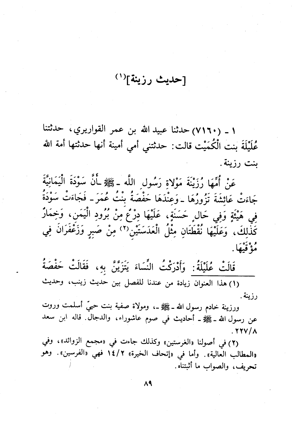 7160 - حَدَّثَنَا عُبَيْدُ اللَّهِ بْنُ عُمَرَ الْقَوَارِيرِيُّ، حَدَّثَتْنَا عُلَيْلَةُ بِنْتُ الْكُمَيْتِ، قَالَتْ: حَدَّثَتْنِي أُمِّي أَمِينَةُ، أَنَّهَا حَدَّثَتْهَا أَمَةُ اللَّهِ بِنْتُ رُزَيْنَةَ، عَنْ أُمِّهَا رُزَيْنَةَ مَوْلَاةِ رَسُولِ اللَّهِ صَلَّى اللهُ عَلَيْهِ وَسَلَّمَ أَنَّ سَوْدَةَ الْيَمَانِيَّةَ جَاءَتْ عَائِشَةَ تَزُورُهَا، وَعِنْدَهَا حَفْصَةُ بِنْتُ عُمَرَ، فَجَاءَتْ سَوْدَةُ فِي هَيْئَةٍ , وَفِي حَالٍ حَسَنَةٍ، عَلَيْهَا دِرْعٌ مِنْ بُرُودِ الْيَمَنِ، وَخِمَارٌ كَذَلِكَ، وَعَلَيْهَا نُقْطَتَانِ مِثْلُ الْعَدَسَتَيْنِ مِنْ صَبِرٍ وَزَعْفَرَانَ فِي مُؤْقَيْهَا ـ قَالَتْ عُلَيْلَةُ: وَأَدْرَكْتُ النِّسَاءَ يَتَزَيَّنَّ بِهِ ـ فَقَالَتْ: حَفْصَةُ -[90]- لِعَائِشَةَ: يَا أُمَّ الْمُؤْمِنِينَ، يَجِيءُ رَسُولُ اللَّهِ صَلَّى اللهُ عَلَيْهِ وَسَلَّمَ فَشِقًا وَهَذِهِ بَيْنَنَا تَبْرُقُ؟ فَقَالَتْ لَهَا أُمُّ الْمُؤْمِنِينَ: اتَّقِي اللَّهَ يَا حَفْصَةُ، اتَّقِي اللَّهَ يَا حَفْصَةُ، قَالَتْ: لَأُفْسِدَنَّ عَلَيْهَا زِينَتَهَا، قَالَتْ: مَا تَقُلْنَ، وَكَانَ فِي أُذُنِهَا ثِقَلٌ، قَالَتْ لَهَا حَفْصَةُ: يَا سَوْدَةُ خَرَجَ الْأَعْوَرُ، قَالَتْ: نَعَمْ، فَفَزِعَتْ فَزَعًا شَدِيدًا، فَجَعَلَتْ تَنْتَفِضُ، قَالَتْ: أَيْنَ أَخْتَبِئُ؟ قَالَتْ: عَلَيْكِ بِالْخَيْمَةِ - خَيْمَةٌ لَهُمْ مِنْ سَعَفٍ يَطْبُخُونَ فِيهَا - فَذَهَبَتْ فَاخْتَبَأَتْ فِيهَا، وَفِيهَا الْقَذَرُ وَنَسْجُ الْعَنْكَبُوتِ، فَجَاءَ رَسُولُ اللَّهِ صَلَّى اللهُ عَلَيْهِ وَسَلَّمَ وَهُمَا تَضْحَكَانِ لَا تَسْتَطِيعَانِ أَنْ تَتَكَلَّمَا مِنَ الضَّحِكِ، قَالَ: «مَاذَا الضَّحِكُ؟»، ثَلَاثَ مِرَارٍ، فَأَوْمَأَتَا بِأَيْدِيهِمَا إِلَى الْخَيْمَةِ، فَذَهَبَ فَإِذَا سَوْدَةُ تُرْعَدُ، فَقَالَ لَهَا: «يَا سَوْدَةُ، مَا لَكِ؟»، قَالَتْ: يَا رَسُولَ اللَّهِ، خَرَجَ الْأَعْوَرُ، قَالَ: «§مَا خَرَجَ , وَلَيَخْرُجَنَّ، مَا خَرَجَ وَلَيَخْرُجَنَّ، مَا خَرَجَ وَلَيَخْرُجَنَّ»، ثُمَّ دَخَلَ فَأَخْرَجَهَا، فَجَعَلَ يَنْفُضُ عَنْهَا الْغُبَارَ وَنَسْجَ الْعَنْكَبُوتِ